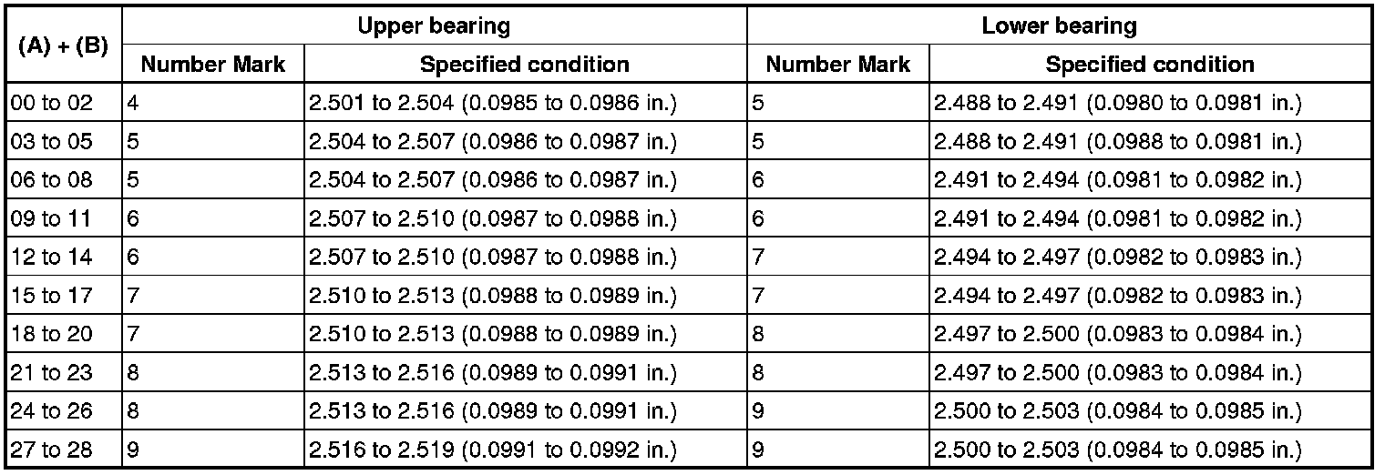 HINT: If replacing a bearing, replace it with one having the same number. If the number of the bearing cannot be determined, select the correct bearing by adding together the numbers imprinted on the cylinder block and crankshaft. Refer to the table for the appropriate bearing number. There are 6 sizes of standard bearings. For No. 1 and No. 5 position bearings, use bearings marked 4, 5, 6, 7, 8 and 9. For other position bearings, use bearing marked 3, 4, 5, 6, 7 and 8.