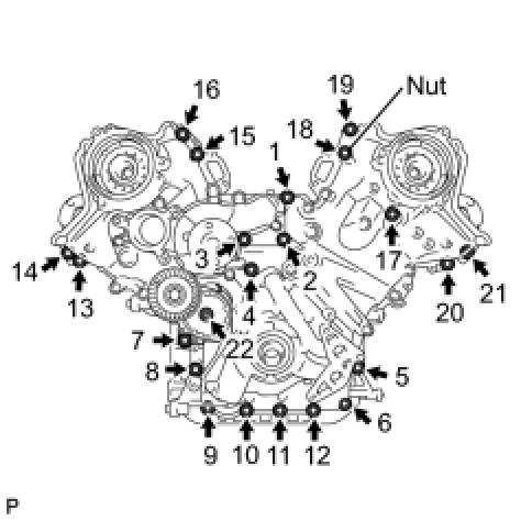 Final pass: Tighten 21 bolts and nut in several steps in sequence 23 Nm (235 kgf-cm, 17 ft-lbf)