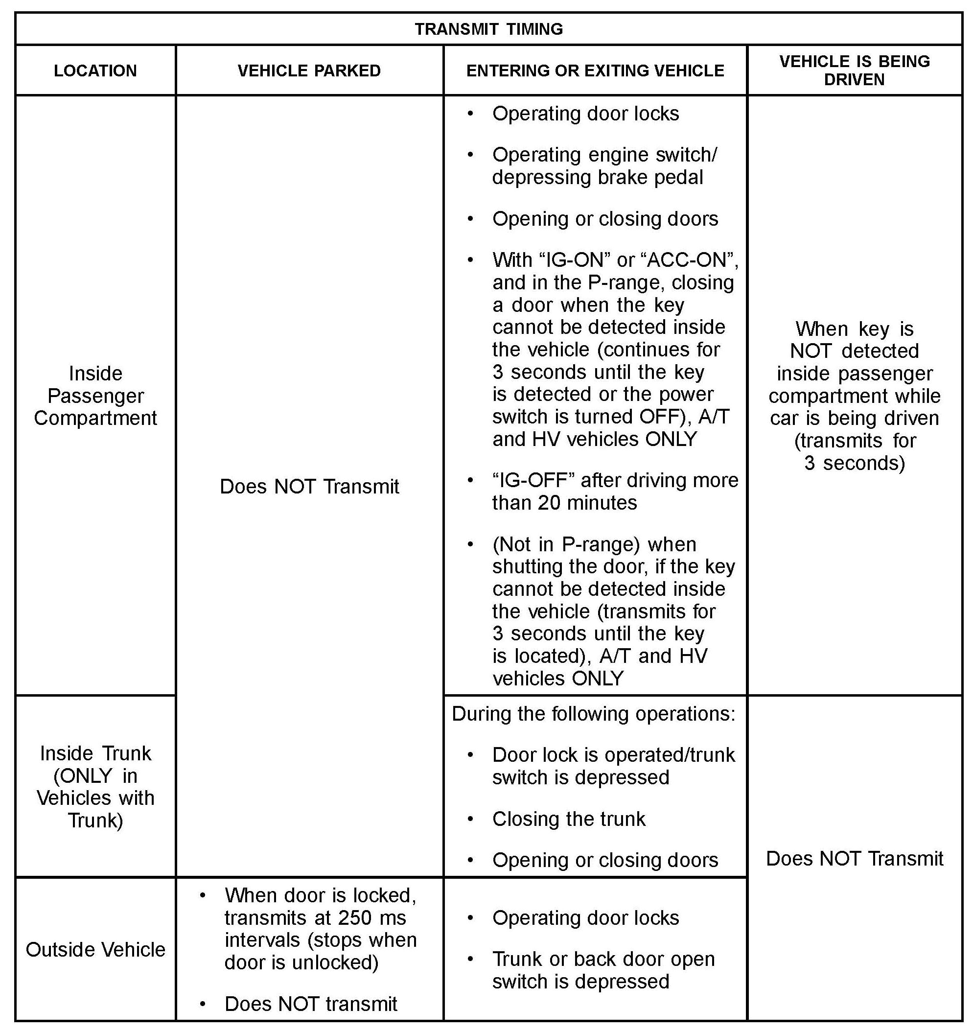 Some customers may inquire about the frequency and power output of the Smart Key/Smart Entry Systems used on various models. The Smart Key/Smart Entry systems conform to all applicable FCC rules. This bulletin details the applicable specifications for these systems.