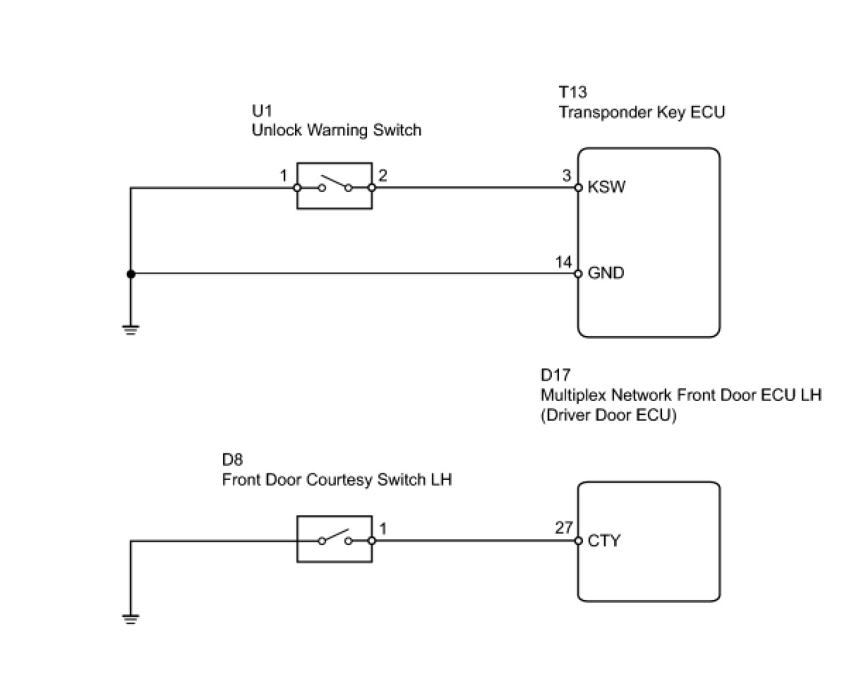 The transponder key ECU uses the unlock warning switch to detect when the key is in the ignition key cylinder, and transmits the detection as a signal to the theft warning ECU. When the door is locked with the ignition switch OFF and the key in the ignition key cylinder, the theft warning ECU transmits the LOCK signal. Then the UNLOCK signal is sent to the multiplex network door ECU front LH and RH. After those operations, the multiplex network front door ECU LH and RH drive the door lock motor.
