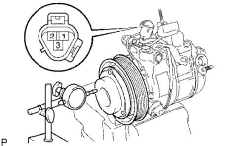 (b) Connect the battery's positive (+) lead to terminal 3 of the magnetic clutch connector and the negative (-) lead to the earth wire. Turn on and off the magnetic clutch and measure the clearance.