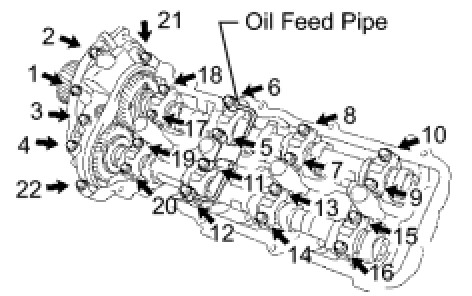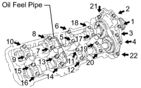 Uniformly tighten the 22 bearing cap bolts in several passes in the sequence shown in the illustration.