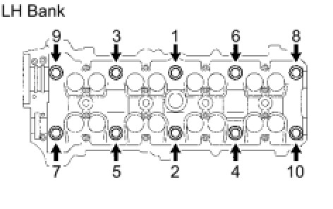Install and uniformly tighten the 10 cylinder head bolts on one side of the cylinder head in several passes in the sequence shown.