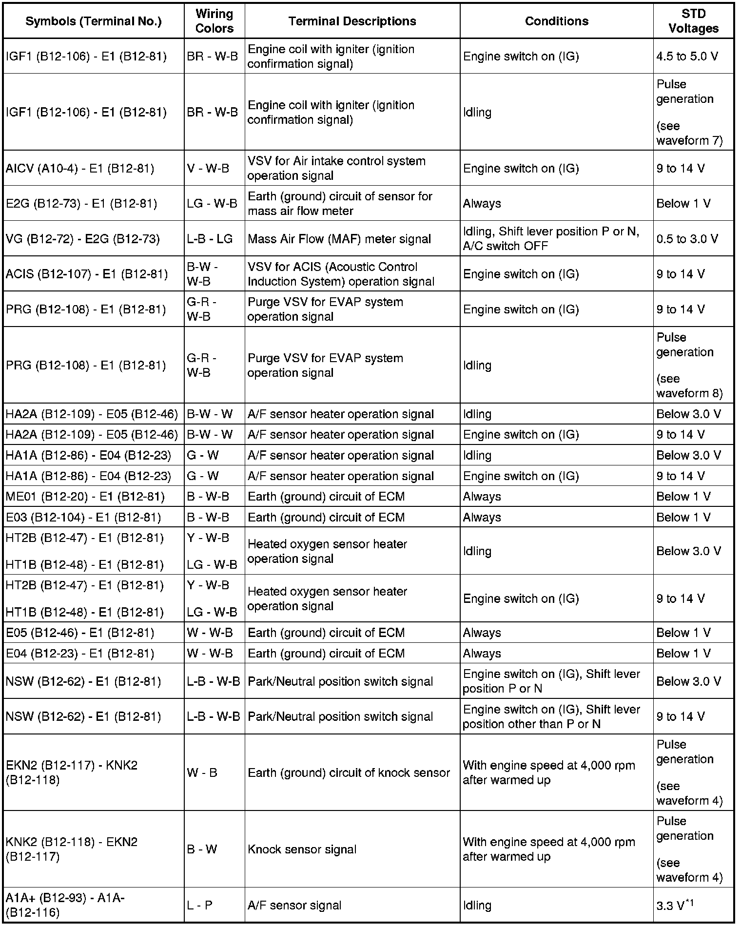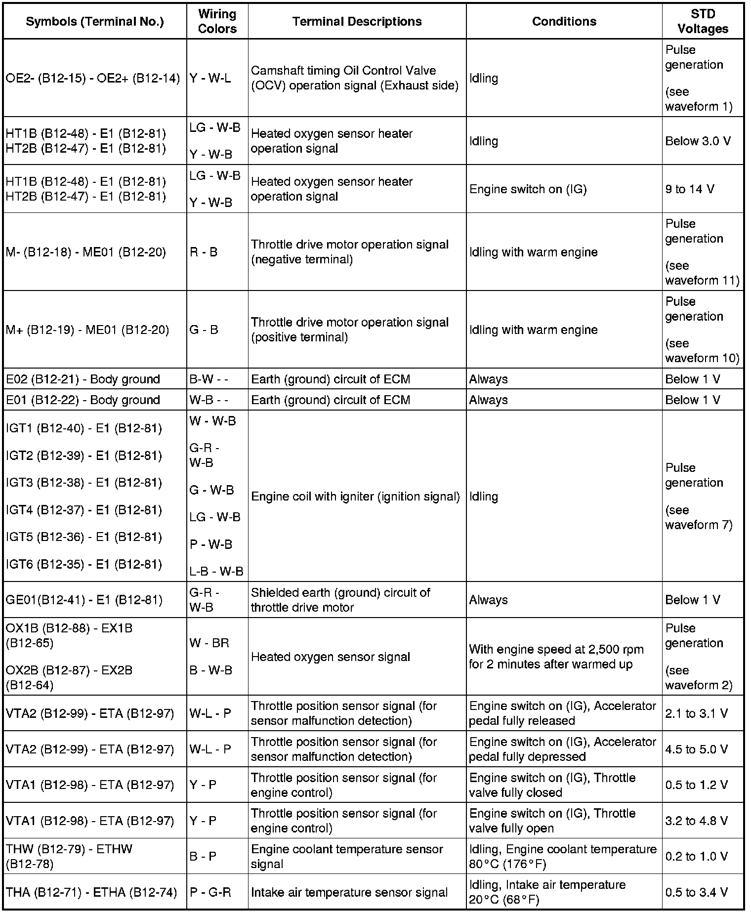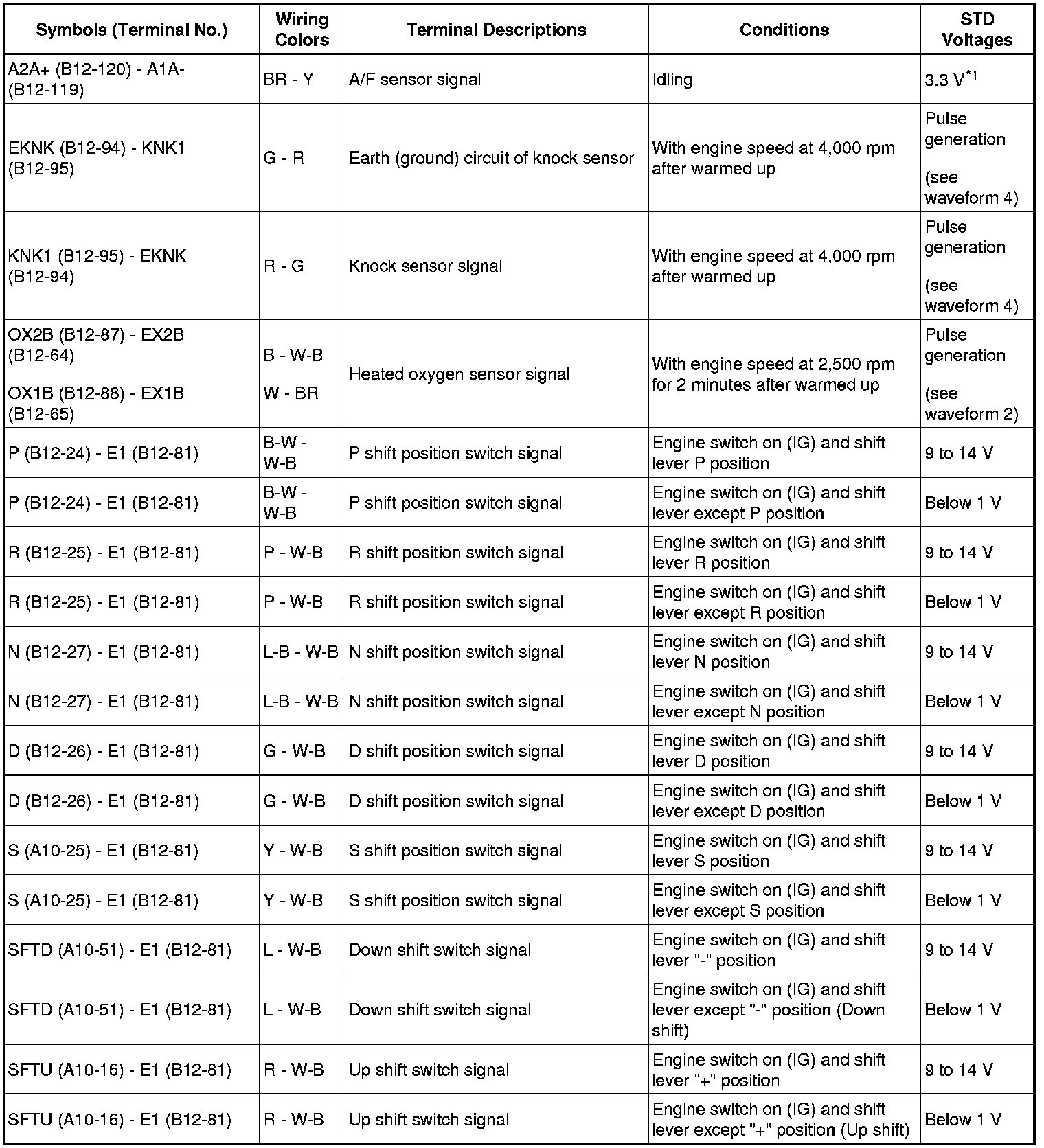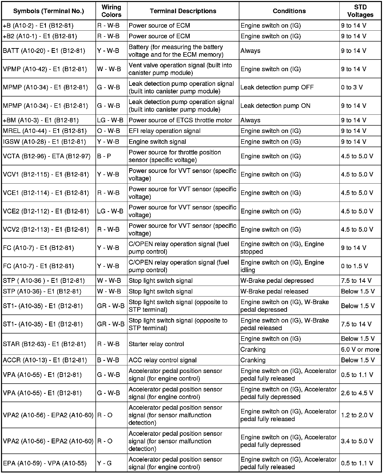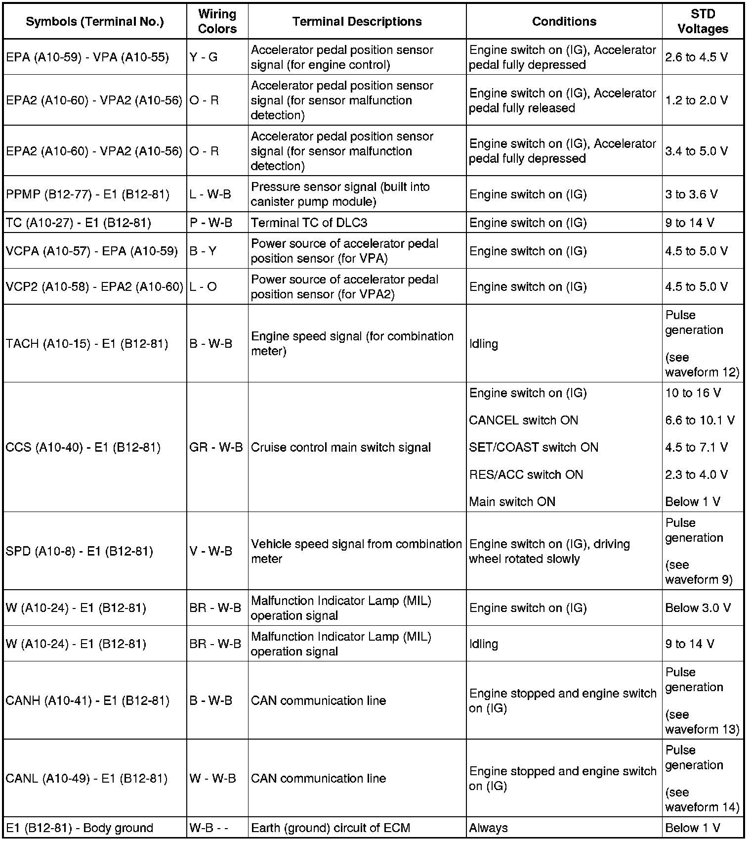 HINT: The standard normal voltage between each pair of the ECM terminals is shown in the table below. The appropriate conditions for checking each pair of the terminals are also indicated.