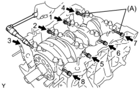 Install 8 new seal washers and uniformly tighten the 8 main bearing cap bolts in several steps and in the sequence shown in the illustration.