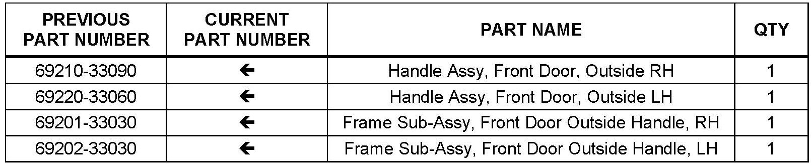 1. Replace front door handle frame and outside handle in affected door Refer to the ETAS/TIS library, applicable model and model year Repair Manual: