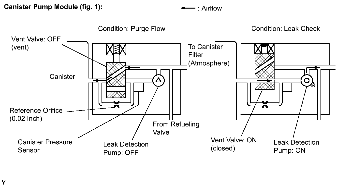 Components Operations Canister Contains activated charcoal to absorb EVAP (Evaporative Emissions) generated in fuel tank. Cut-off valve Located in fuel tank. Valve floats and closes when fuel tank is 100 % full. Purge VSV (Vacuum Switching Valve) Opens or closes line between canister and intake manifold. ECM uses purge VSV to control EVAP purge flow. In order to discharge EVAP absorbed by canister to intake manifold, ECM opens purge VSV. EVAP discharge volume to intake manifold is controlled by purge VSV duty cycle ratio (current-carrying time) (Open: ON; Closed: OFF). Refueling valve Controls EVAP pressure from fuel tank to canister. Valve consists of diaphragm, spring and restrictor (diameter: 0.08 inch). When fuel vapor and pressure inside fuel tank increase, valve opens. While EVAP is purged, valve closes and restrictor prevents large amount of vacuum from affecting pressure in fuel tank. Valve is opened while refueling. Roll-over valve Located in fuel tank. Valve is closed by its own weight when vehicle overturns to prevent fuel from spilling out. Soak timer Built into ECM. To ensure accurate EVAP monitor, measures 5 hours (+-15 min) after engine switch is turned off. This allows fuel to cool down, stabilizing EVAP pressure. When approximately 5 hours have elapsed, ECM is activated (refer to fig. 3 in Fig 6). Canister pump module Consists of (a) to (d) below. Canister pump module cannot be disassembled. (a) Vent valve Vents and closes EVAP system. When ECM turns valve ON, EVAP system is closed. When ECM turns valve off, EVAP system is vented. Negative pressure (vacuum) is created in EVAP system to check for EVAP leaks by closing purge VSV, turning on vent valve (closed) and operating leak detection pump (refer to fig. 1 in Fig 4). (b) Canister pressure sensor Indicates pressure as voltages. ECM supplies regulated 5 V to canister pressure sensor, and uses feedback from sensor to monitor EVAP system pressure (refer to fig. 2 in Fig 5). (c) Leak detection pump Creates negative pressure (vacuum) in EVAP system for leak check. (d) Reference orifice Has opening with 0.02 inch diameter. Vacuum is produced through orifice by closing purge VSV, turning off vent valve and operating leak detection pump, to monitor reference pressure. Reference pressure indicates small leak of EVAP. - The 1st monitor