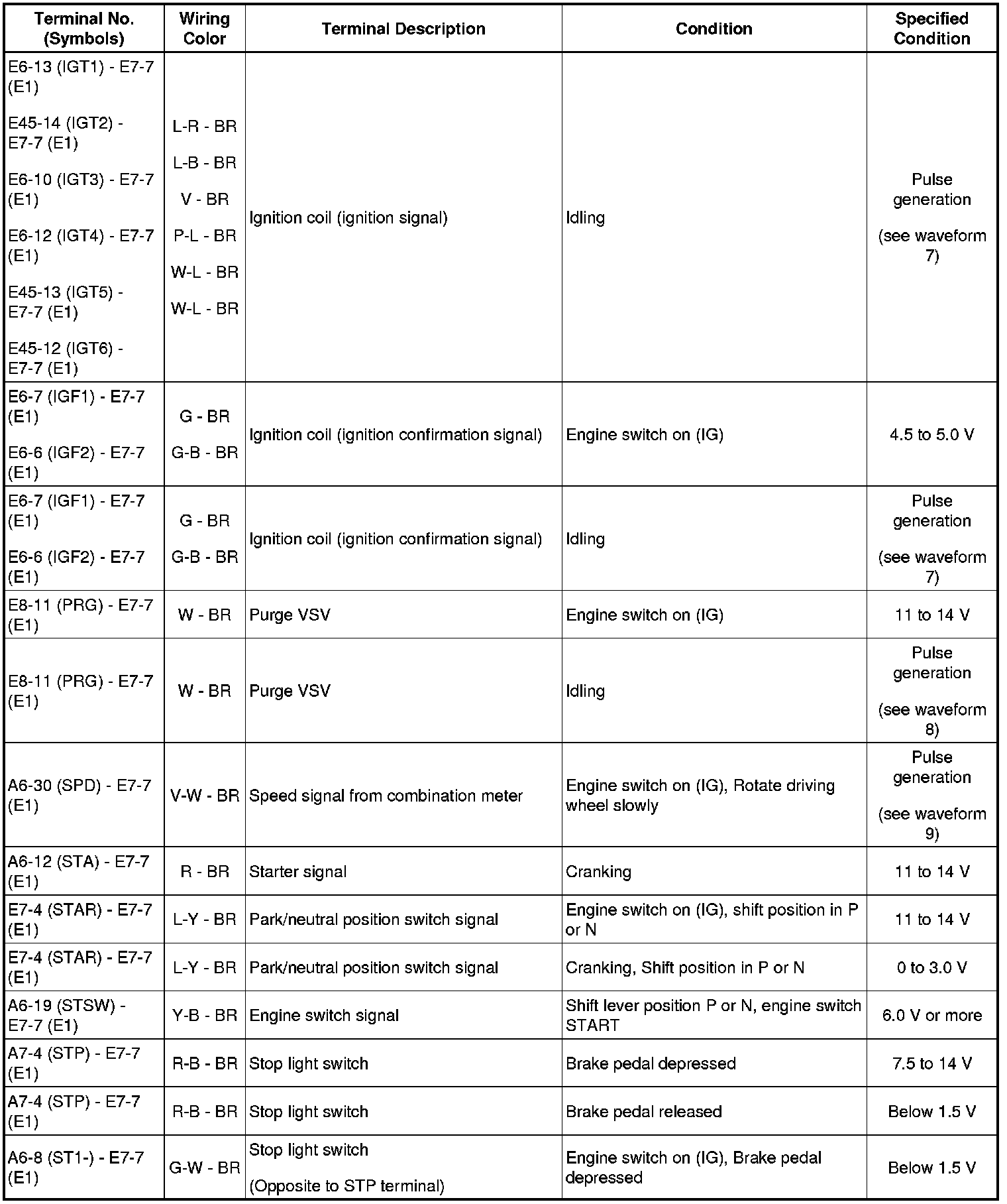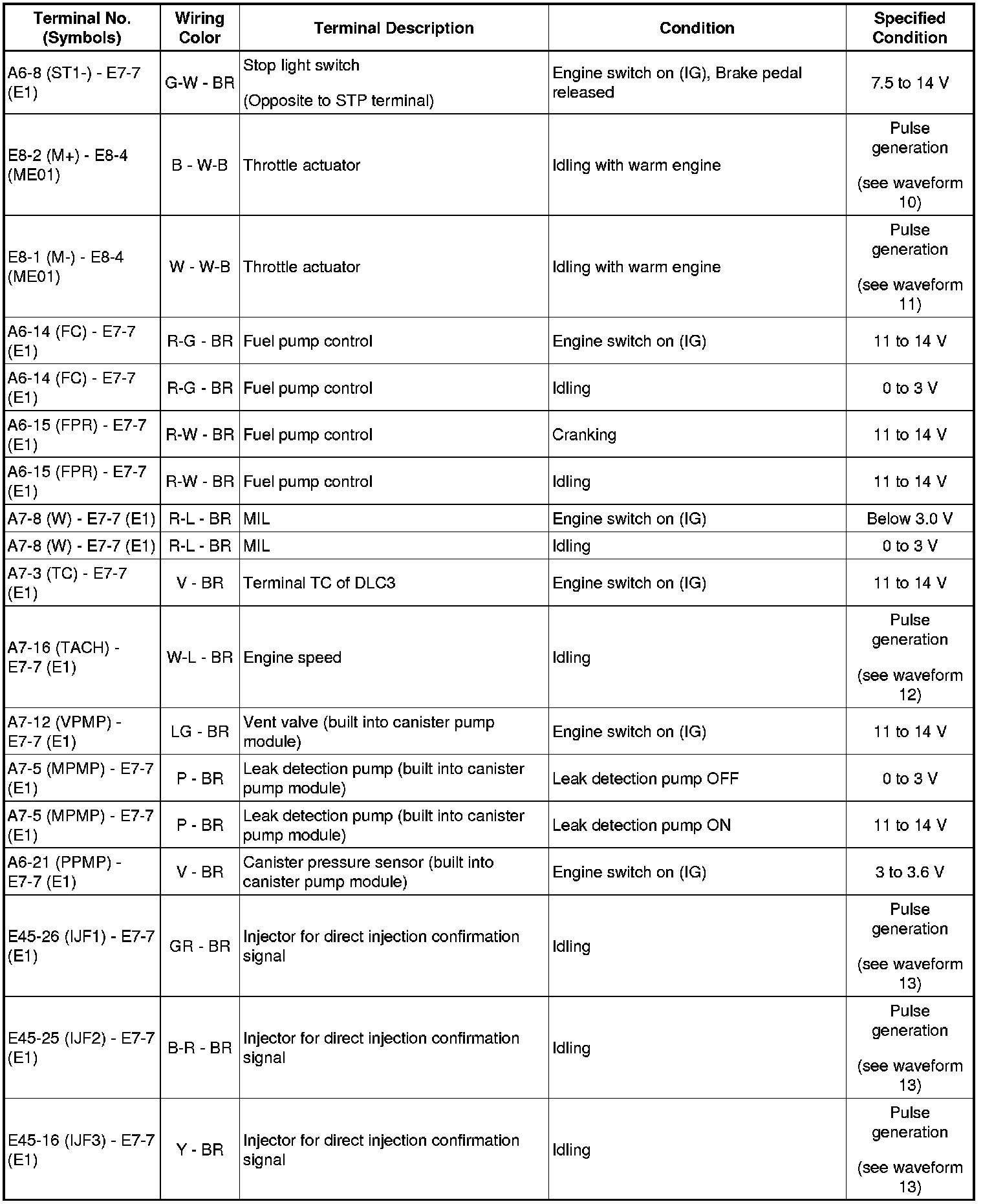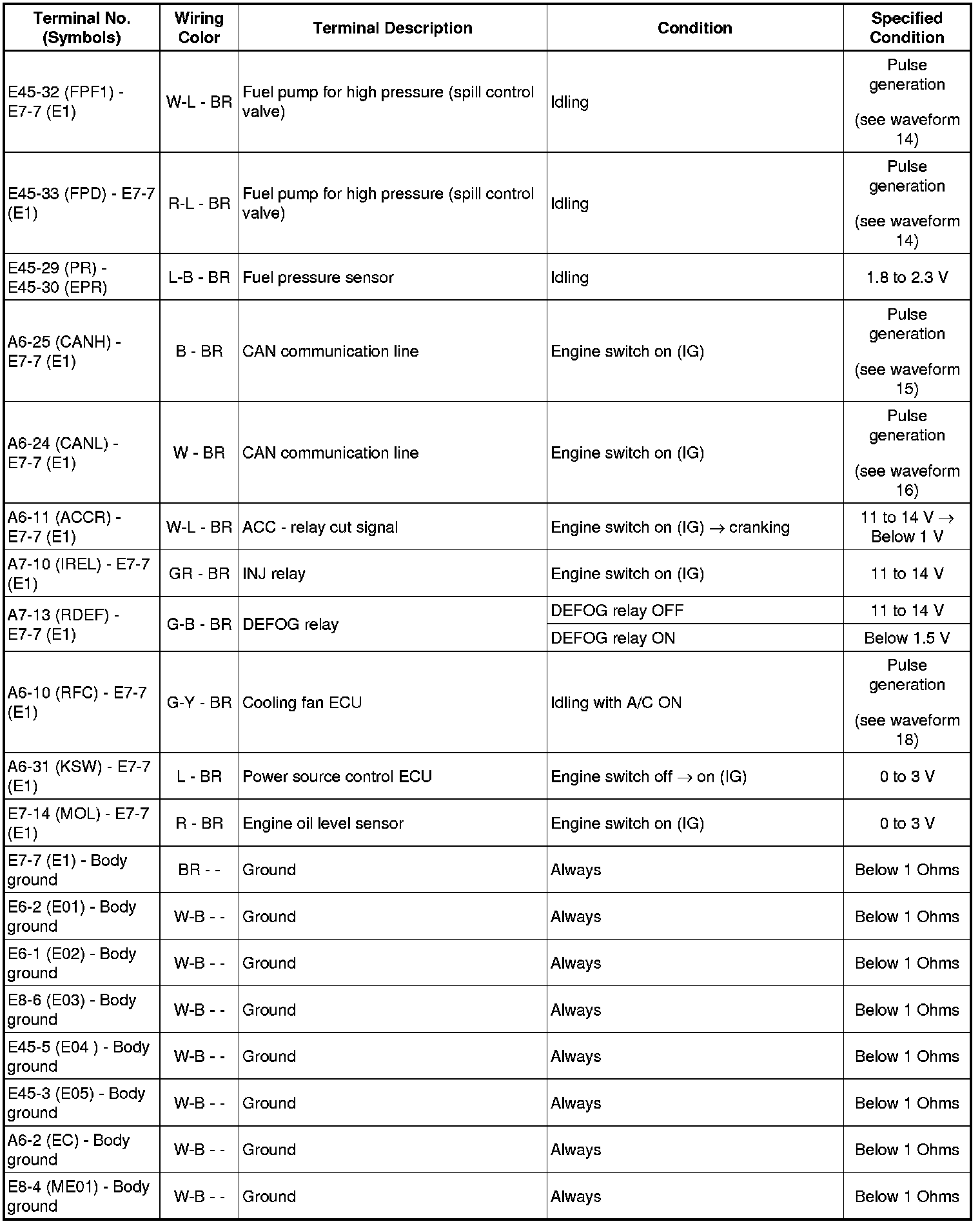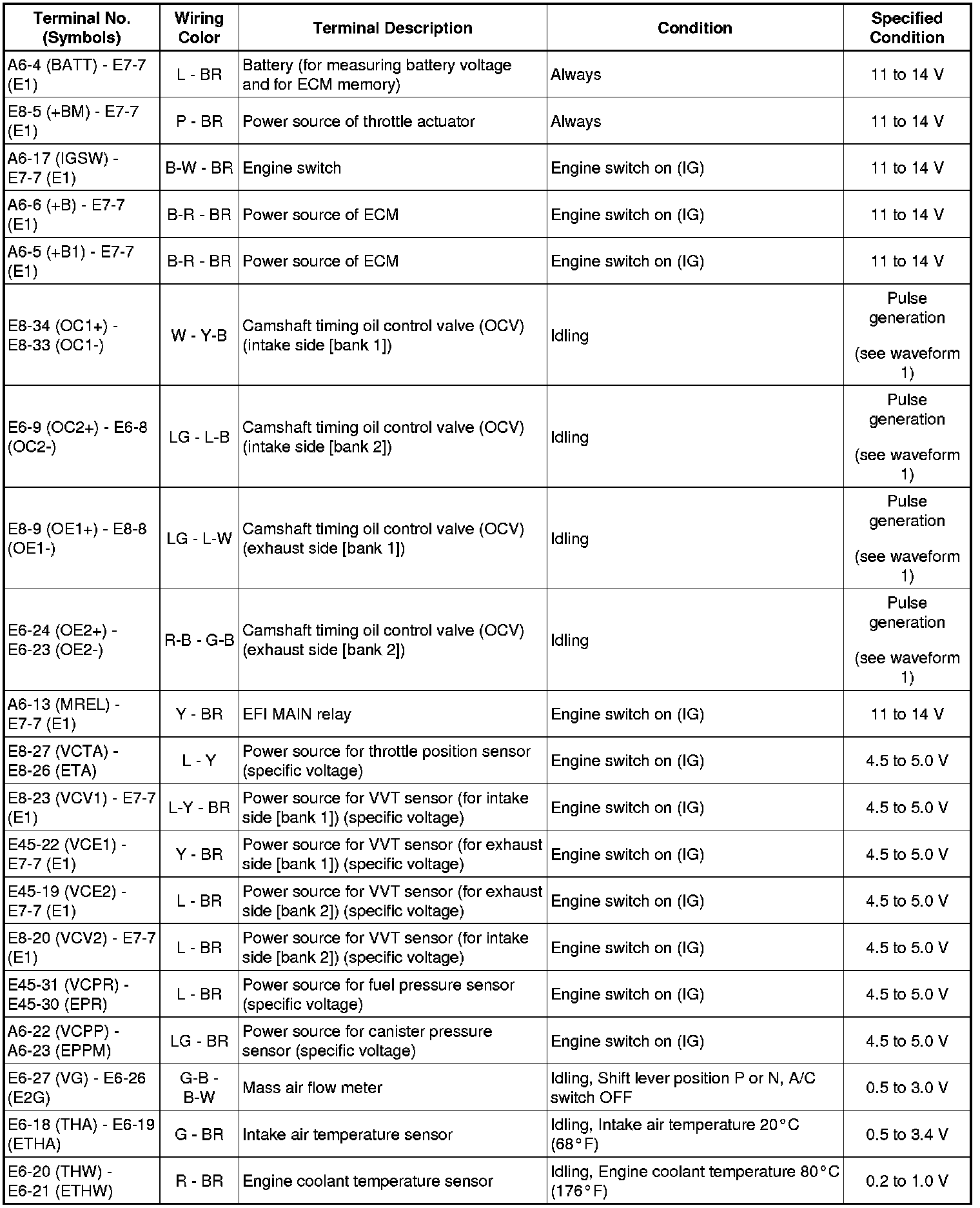 HINT: The standard normal voltage between each pair of the ECM terminals is shown in the table below. The appropriate conditions for checking each pair of the terminals are also indicated. The result of checks should be compared with the standard normal voltage for that pair of terminals, displayed in the Specified Condition column. The illustration above can be used as a reference to identify the ECM terminal locations.