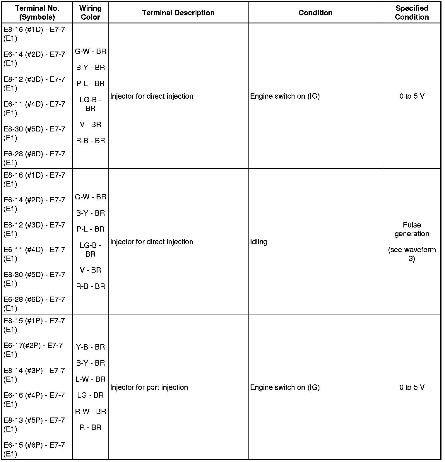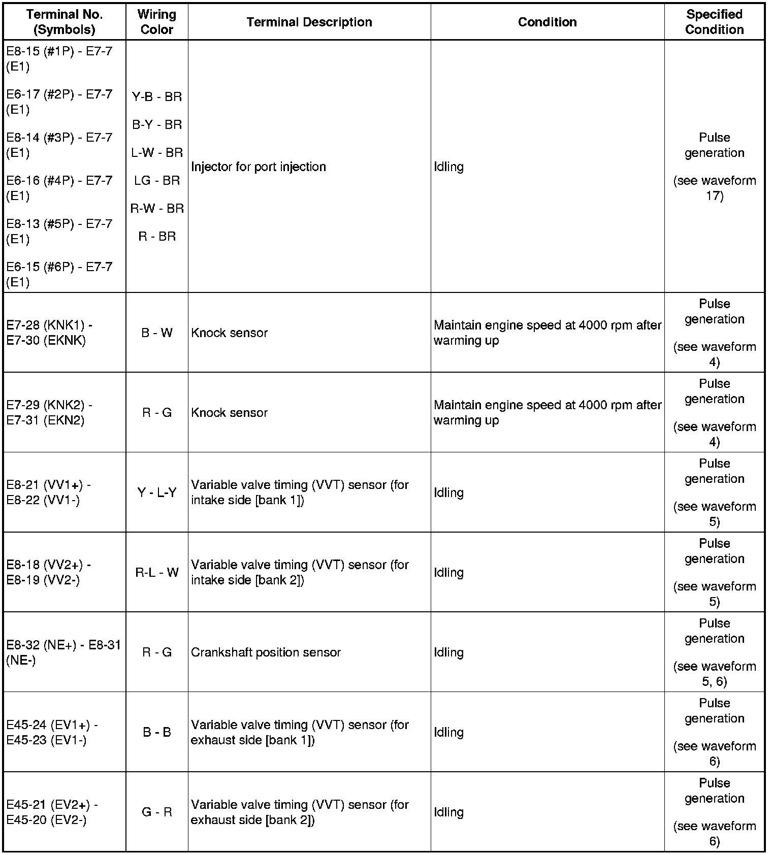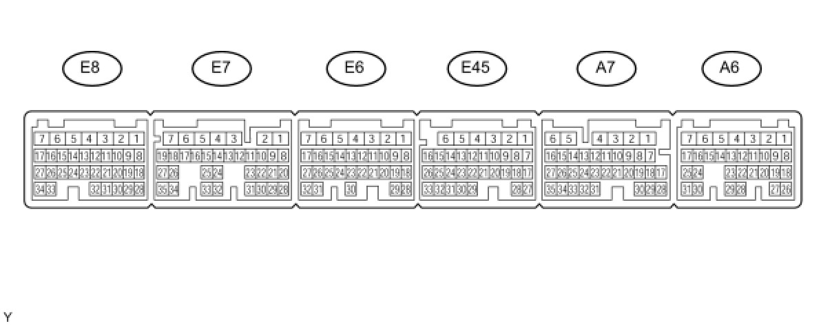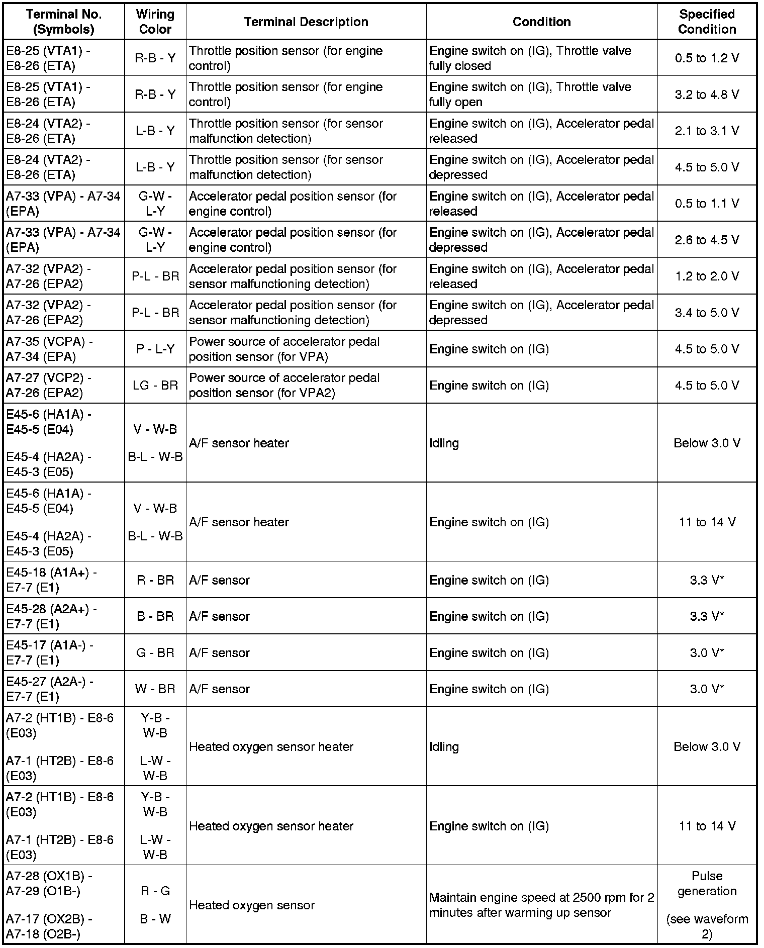 HINT: The standard normal voltage between each pair of the ECM terminals is shown in the table below. The appropriate conditions for checking each pair of the terminals are also indicated. The result of checks should be compared with the standard normal voltage for that pair of terminals, displayed in the Specified Condition column. The illustration above can be used as a reference to identify the ECM terminal locations.