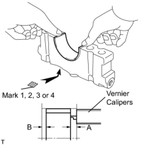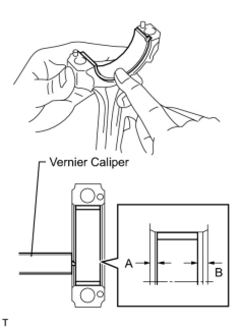 Using a vernier caliper, measure the distance between the bearing cap's edge and the lower bearing's edge.