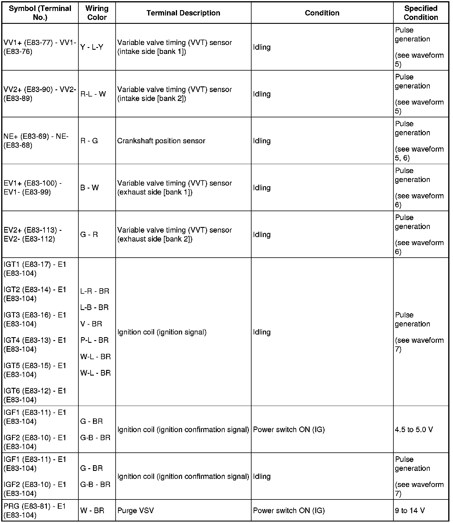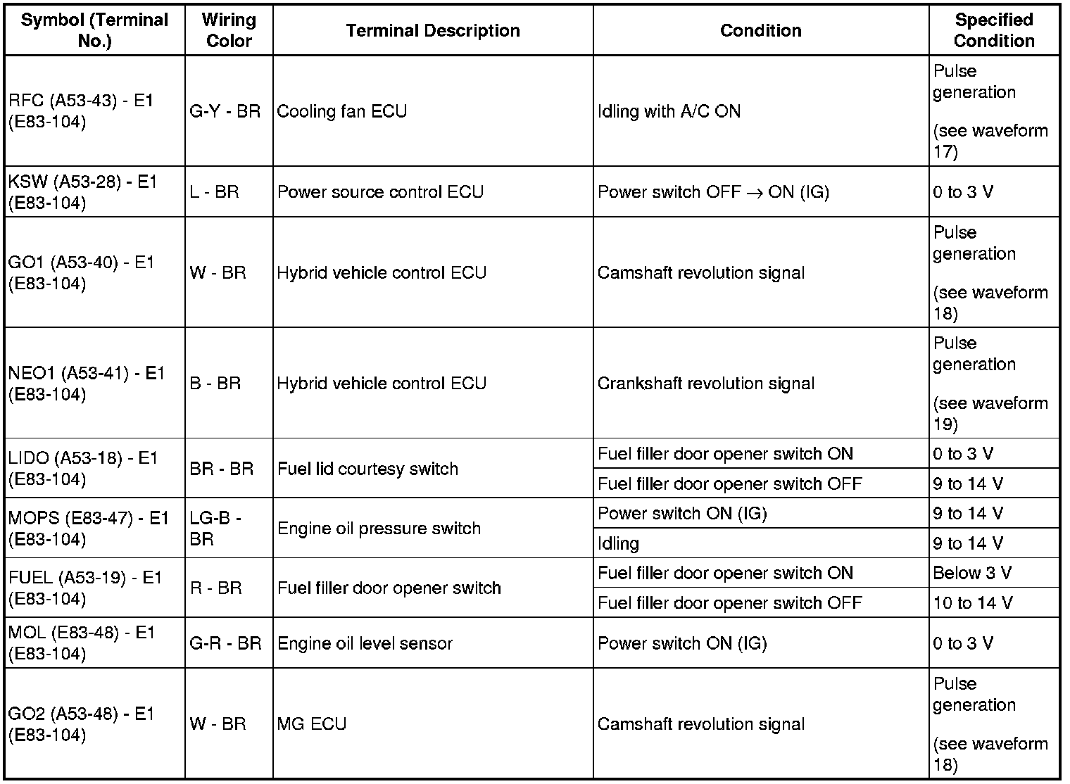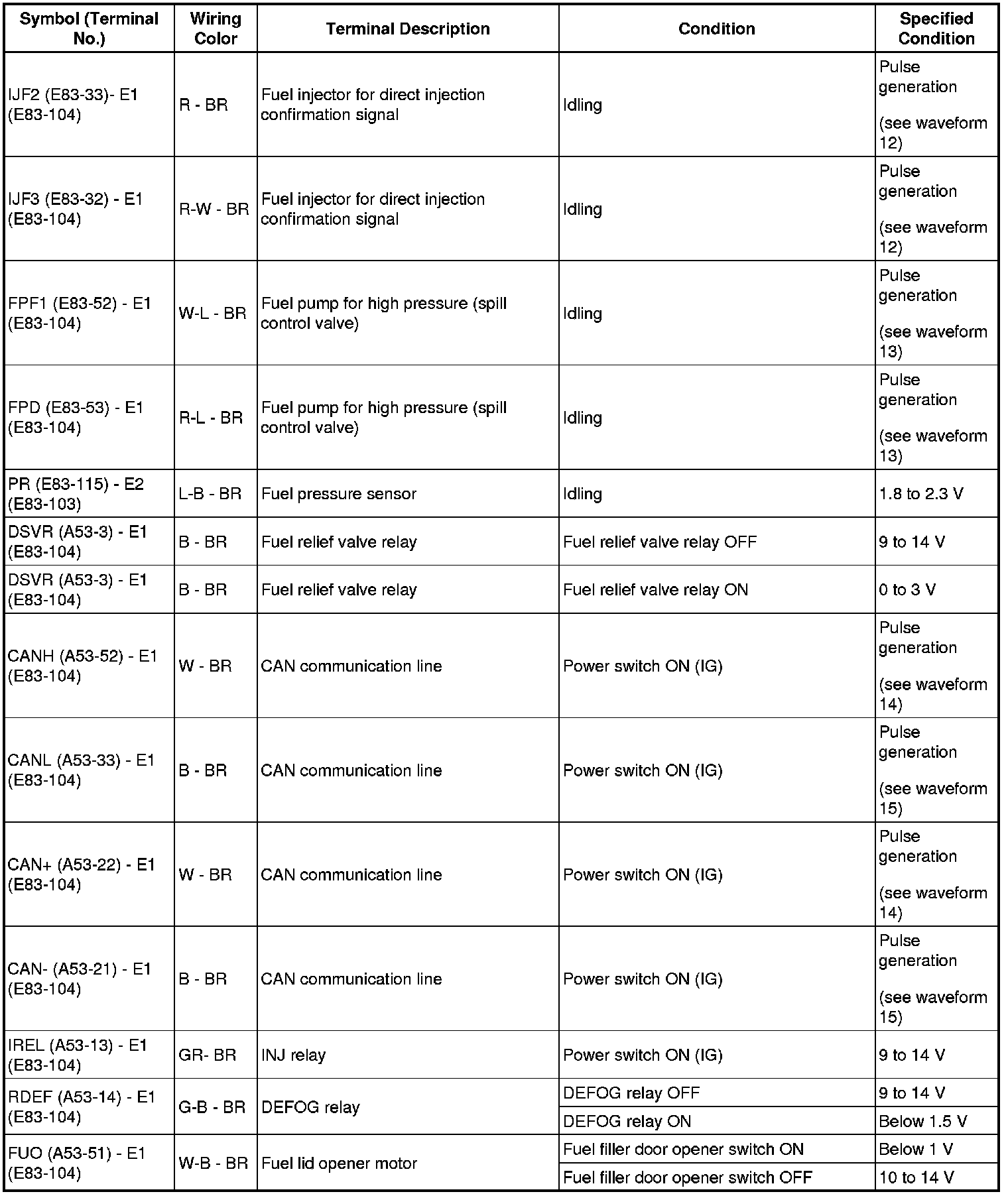 - The standard normal voltage (reference values) between each pair of the ECM terminals is shown in the table below. The appropriate conditions for checking each pair of the terminals are also indicated. The result of checks should be compared with the standard normal voltage for that pair of terminals, displayed in the Specified Condition column. The illustration above can be used as a reference to identify the ECM terminal locations.