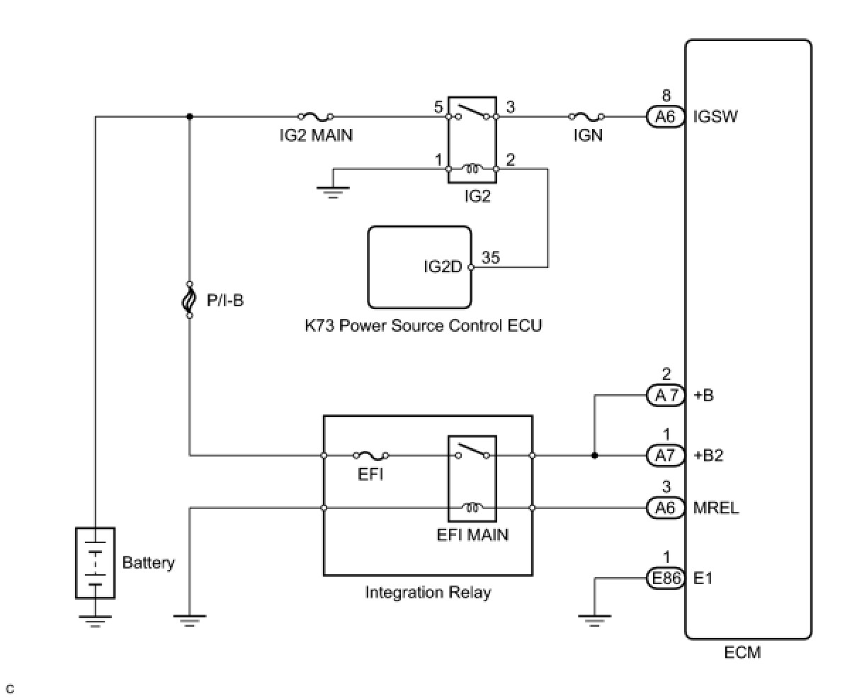 When the engine switch is turned on (IG), voltage from the ECM's MREL terminal is applied to the EFI MAIN relay. This causes the contacts of the EFI MAIN relay to close, which supplies power to terminals +B and +B2 of the ECM.
