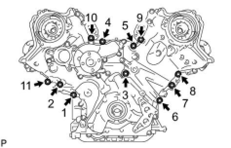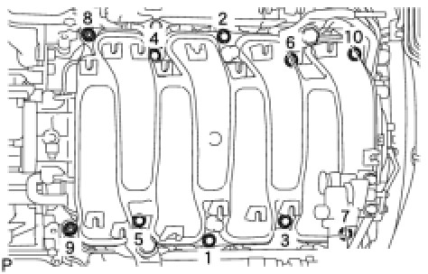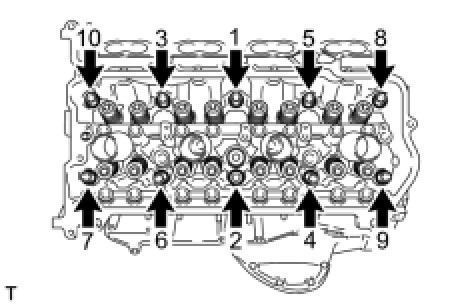 (1) Using a 10 mm bi-hexagon wrench, install and uniformly tighten the 10 cylinder head bolts with the plate washers in several steps, in the sequence shown in the illustration.