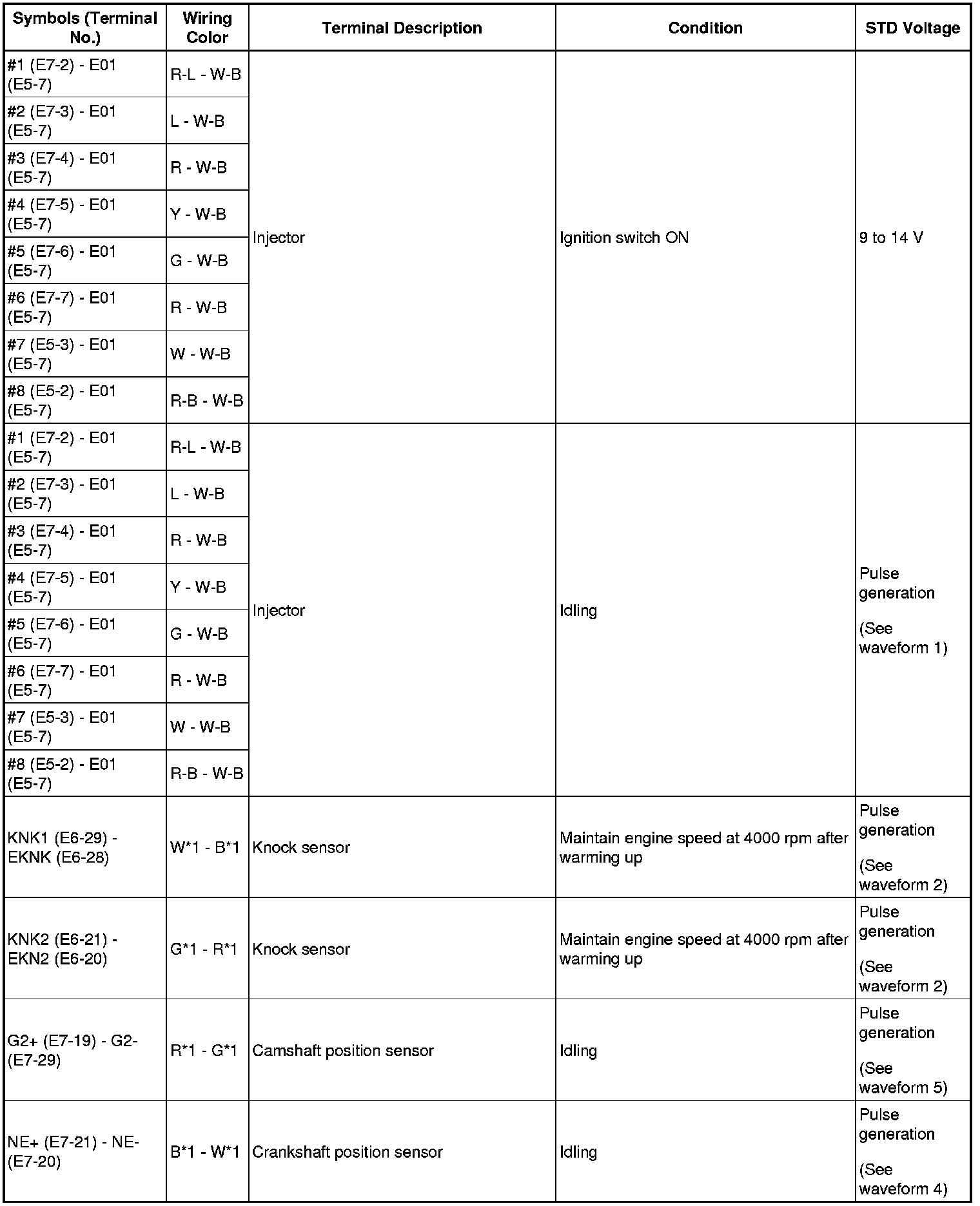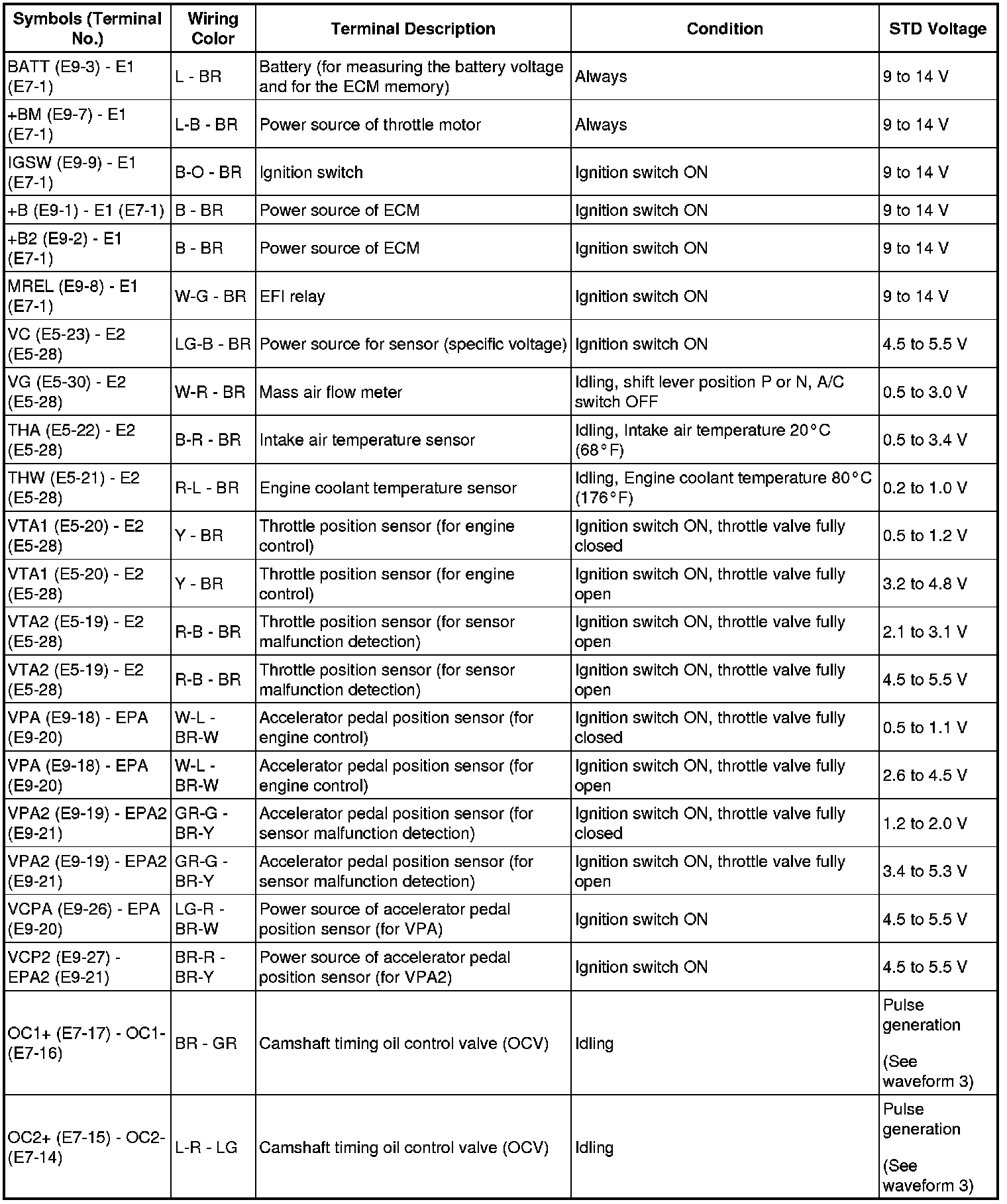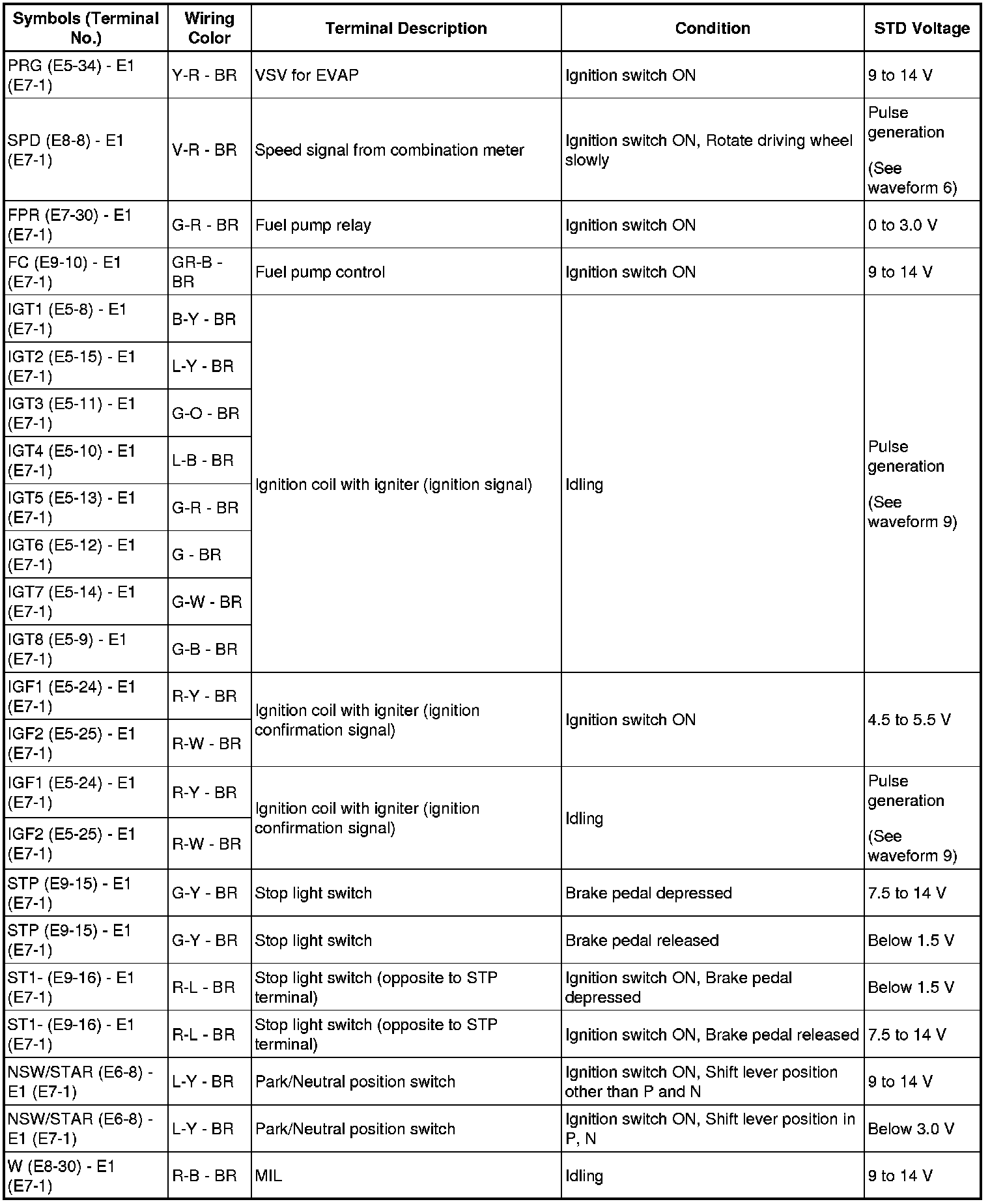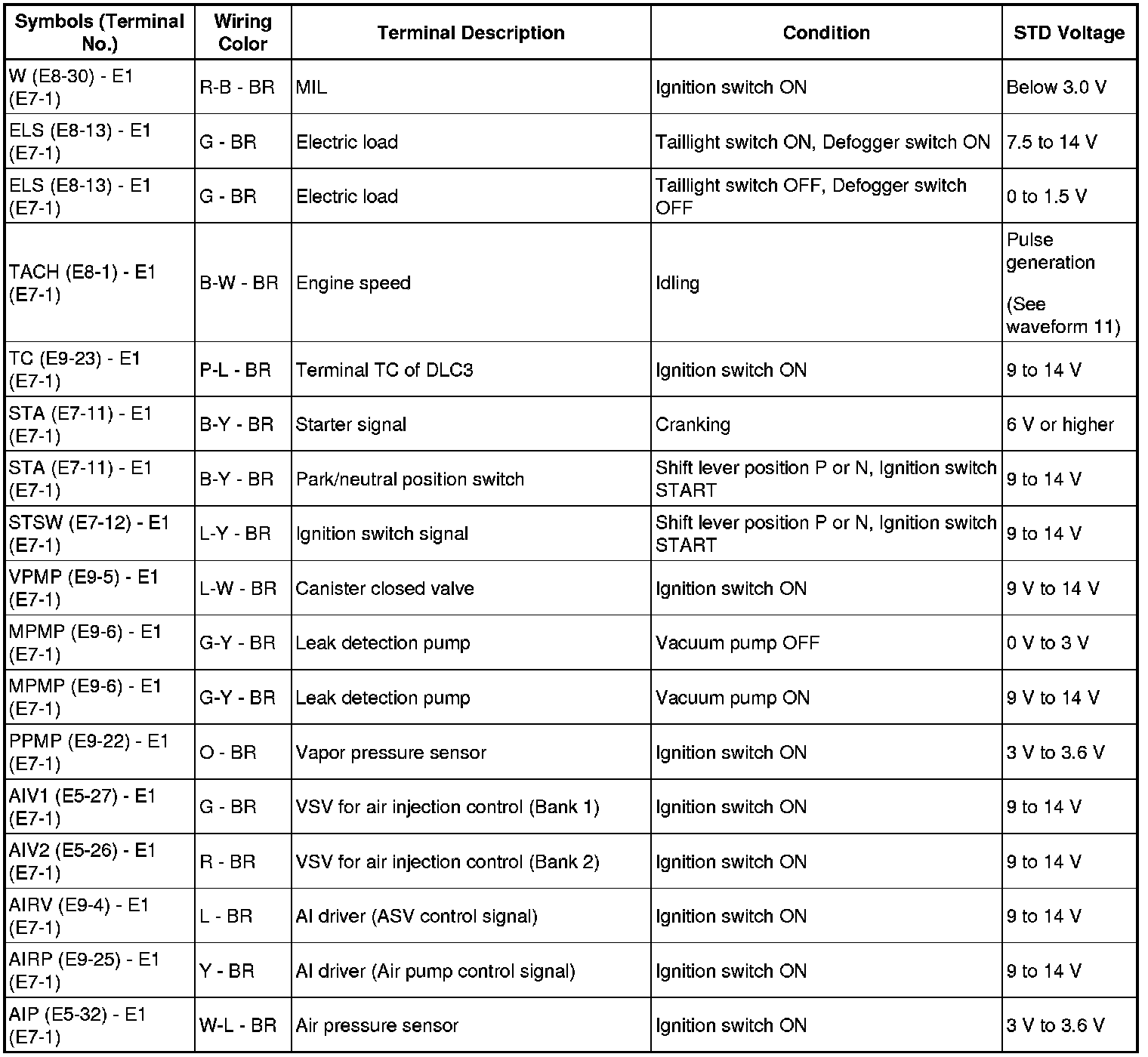 HINT: The standard normal voltage between each pair of ECM terminals is shown in the table below. The appropriate conditions for checking each pair of terminals are also indicated. The result of checks should be compared with the standard normal voltage for that pair of terminals, displayed in the STD Voltage column. The illustration above can be used as a reference to identify the ECM terminal locations.