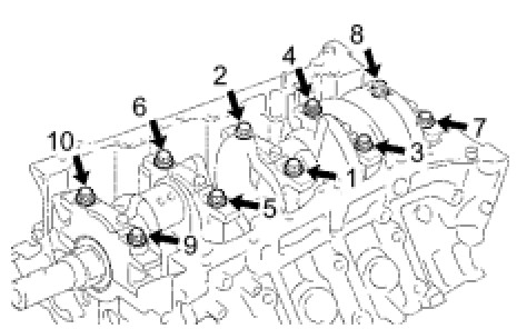 (2) Install and uniformly tighten the 10 crankshaft bearing cap bolts in several steps, in the order shown in the illustration.