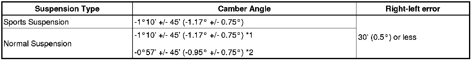 If the measured value is not within the specified range, inspect the suspension parts for damage and wear. Replace parts as necessary because camber cannot be properly adjusted with any damaged or worn parts.