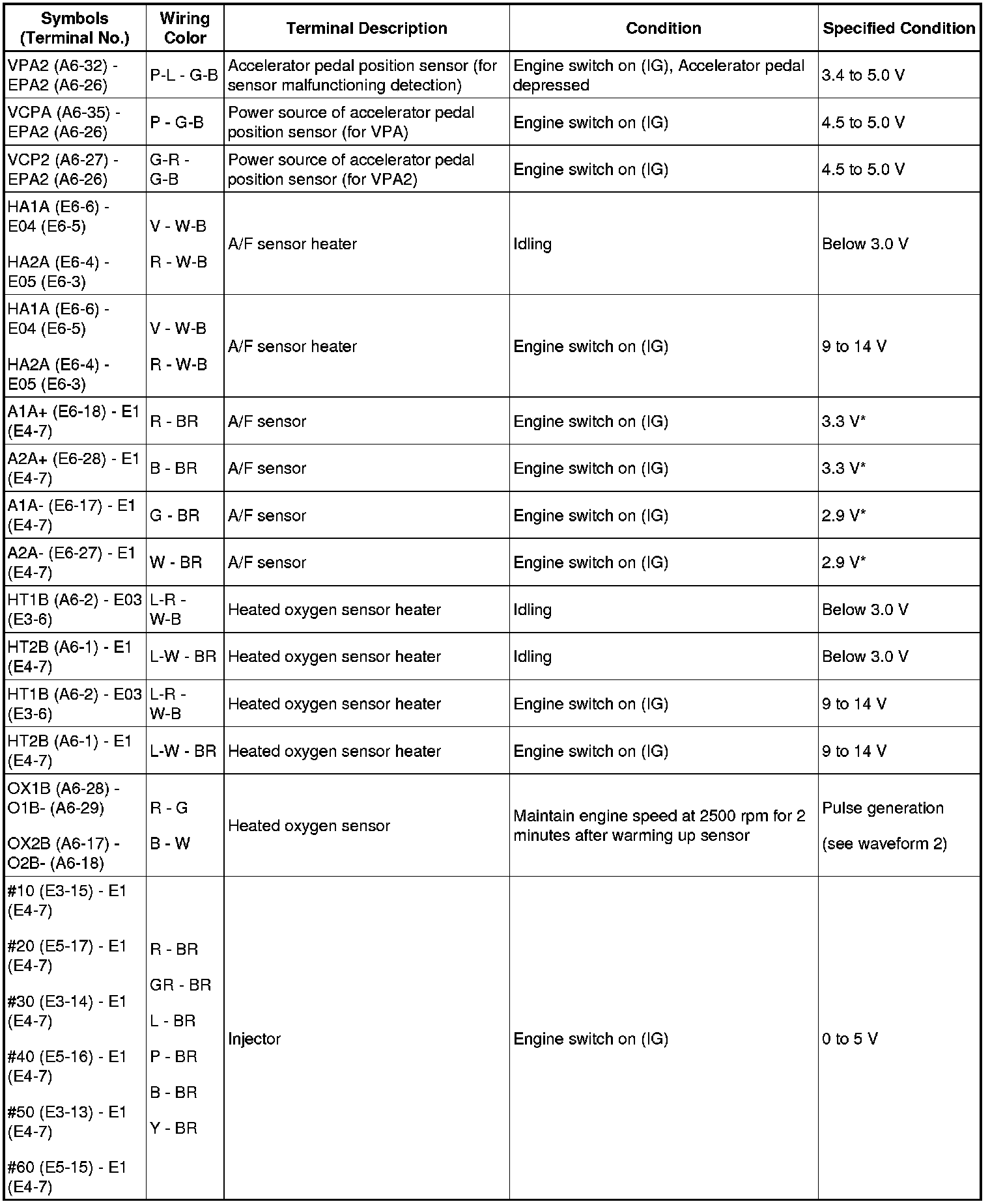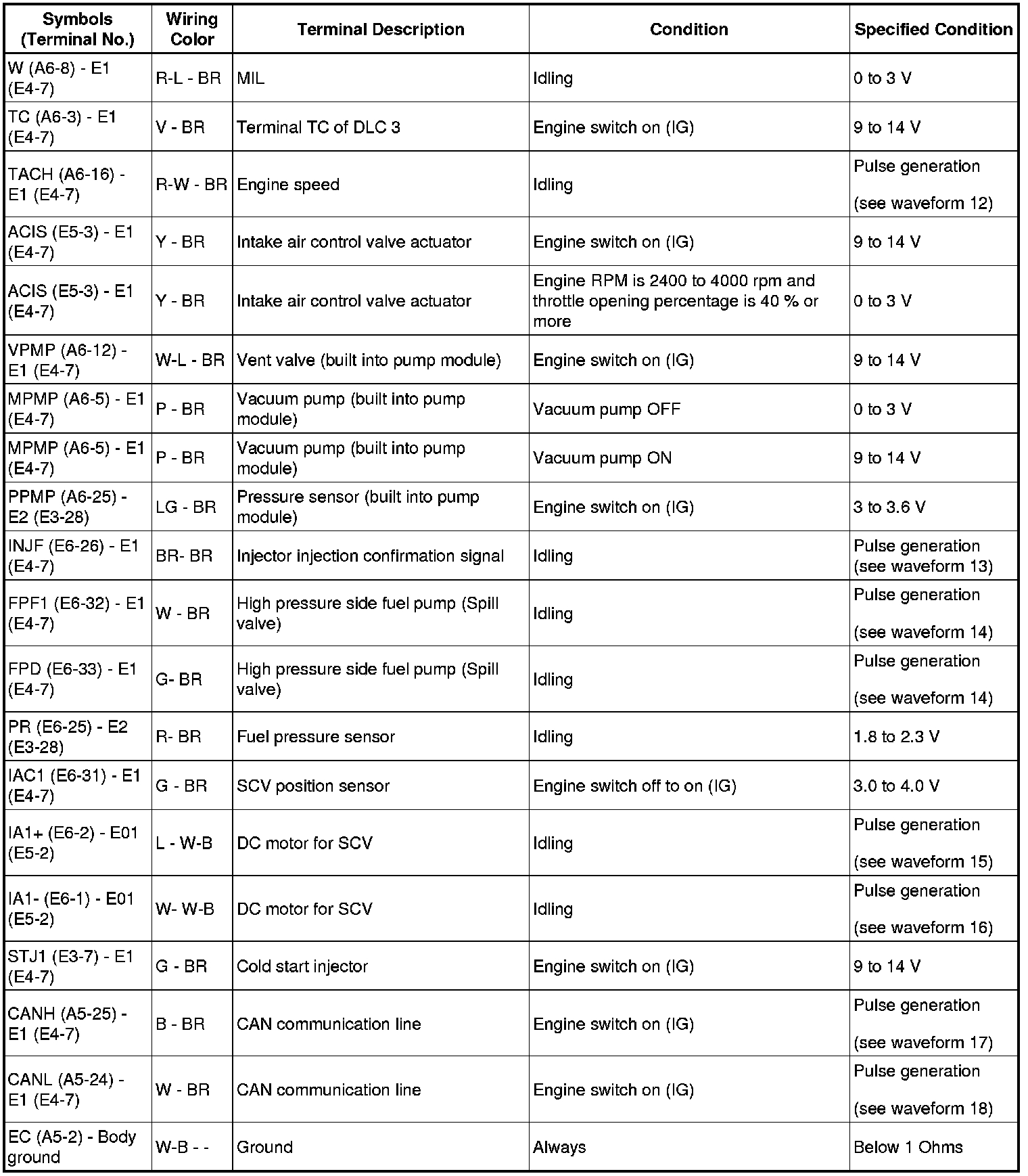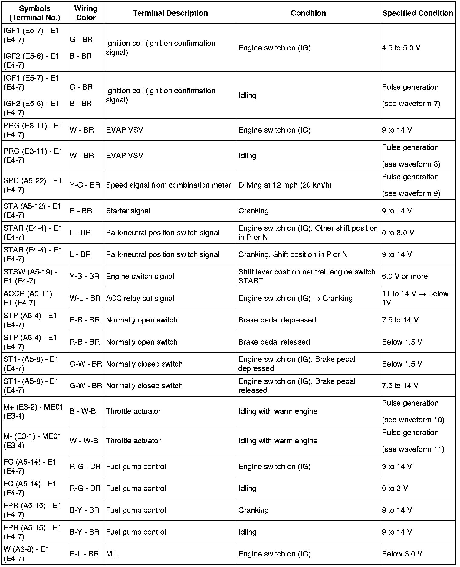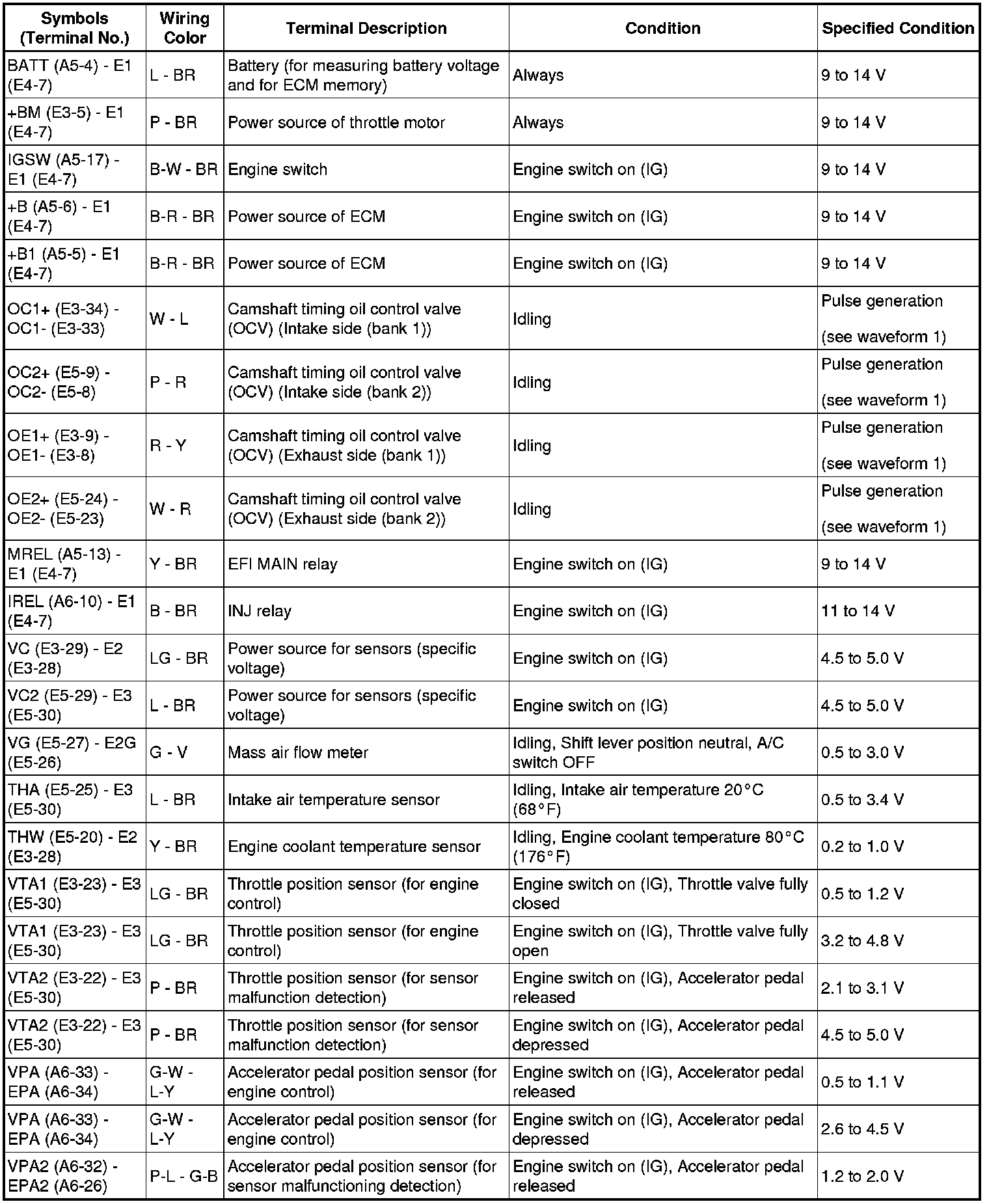 The standard normal voltage between each pair of the ECM terminals is shown in the table below. The appropriate conditions for checking each pair of the terminals are also indicated. The result of checks should be compared with the standard normal voltage for that pair of terminals, displayed in the Specified Condition column. The illustration above can be used as a reference to identify the ECM terminal locations.