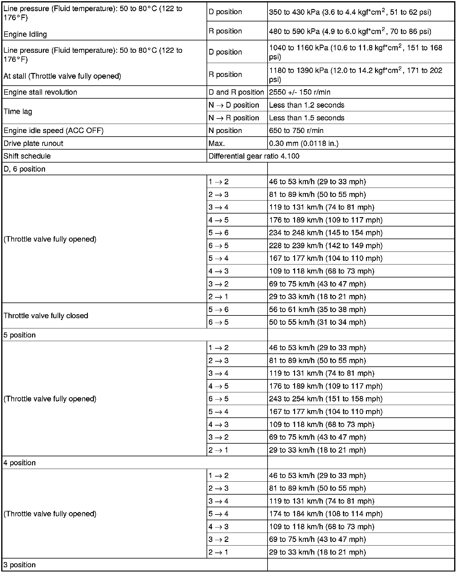 - All shift point values indicated in the above tables are actual values. Therefore, if checking a shift point with a chassis dynamometer, keep in mind that there is a range of error in the chassis dynamometer indication.