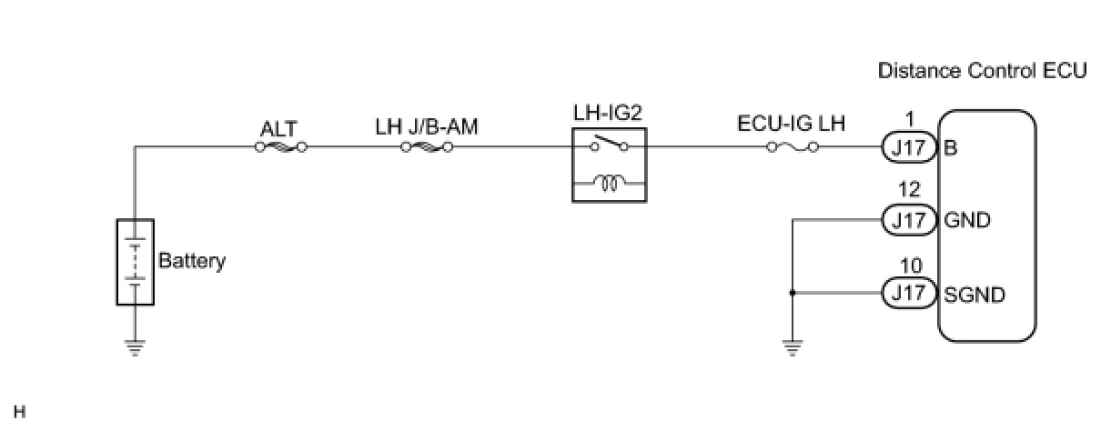 This circuit provides power to operate the distance control ECU. The distance control ECU determines information about the vehicle in front based on data from the radar sensor, and then decides how much acceleration and/or deceleration is needed to maintain the set distance. The distance control ECU also requests the skid control ECU to apply braking and to sound the buzzer.