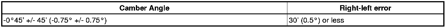 If the measured value is not within the specified range, inspect the suspension parts for damage and wear. Replace parts as necessary because camber cannot be properly adjusted with any damaged or worn parts.