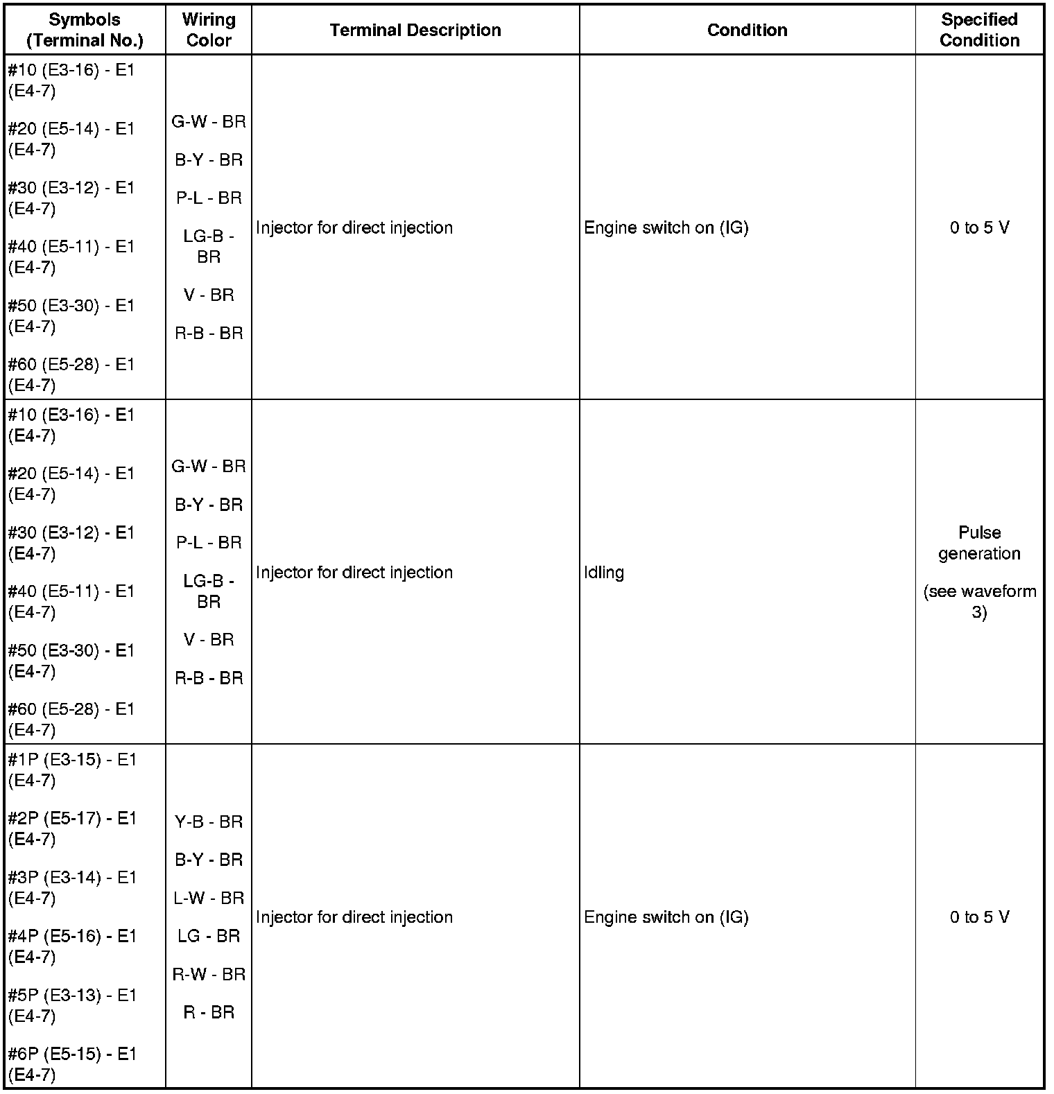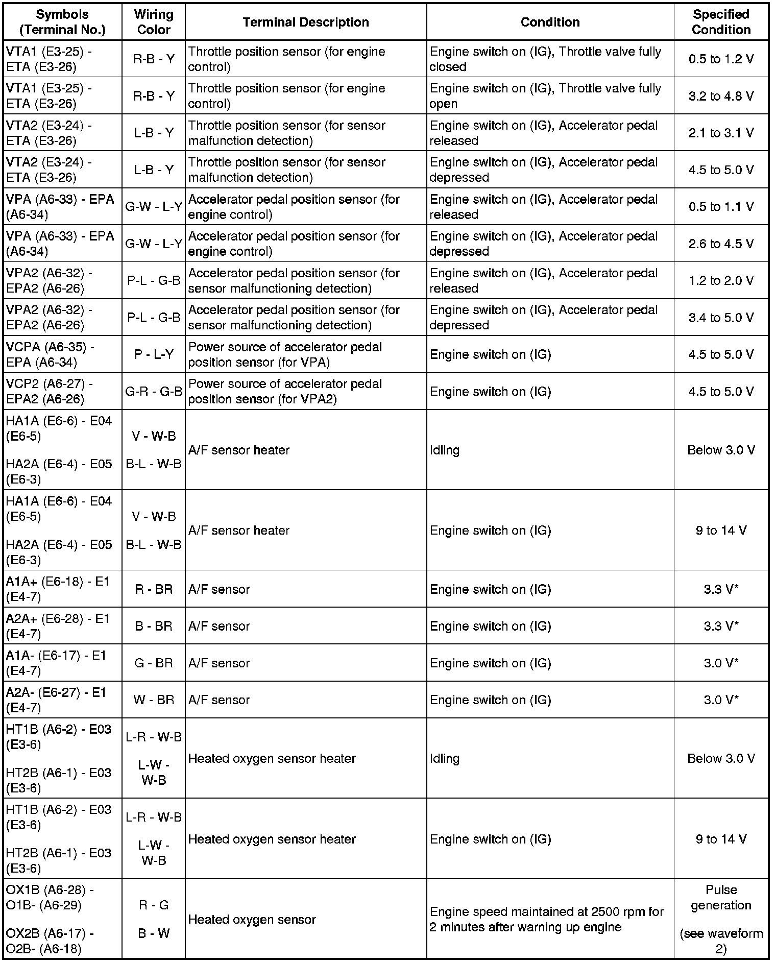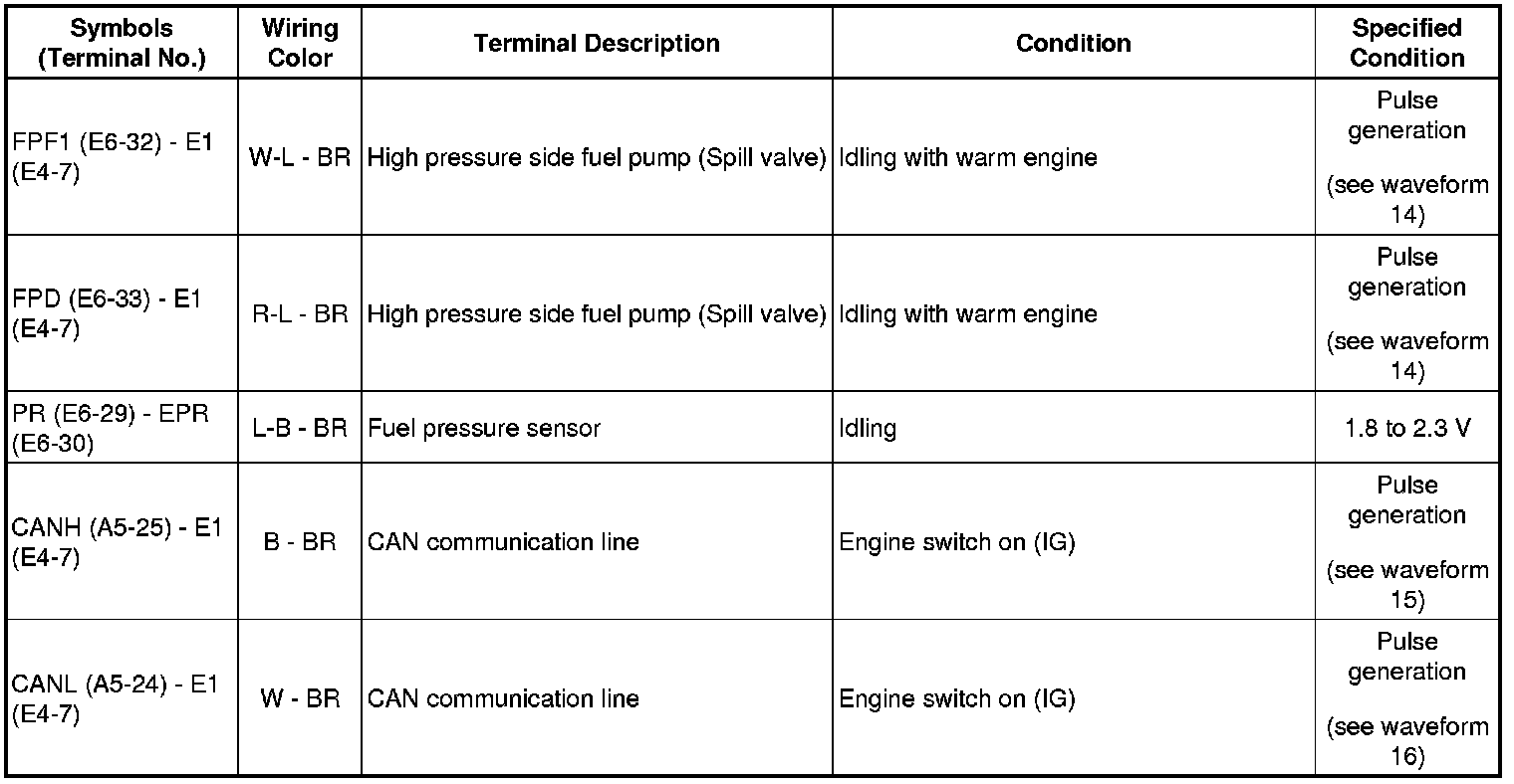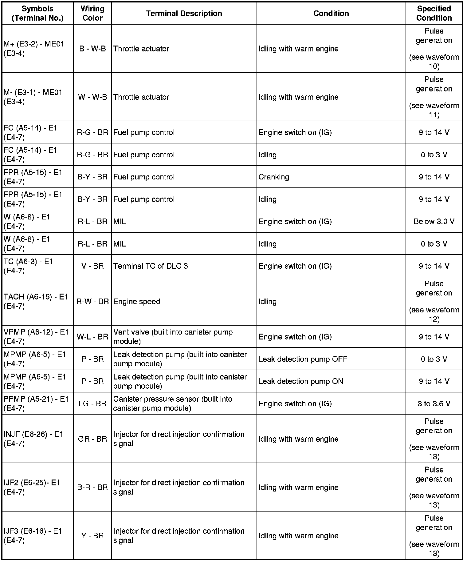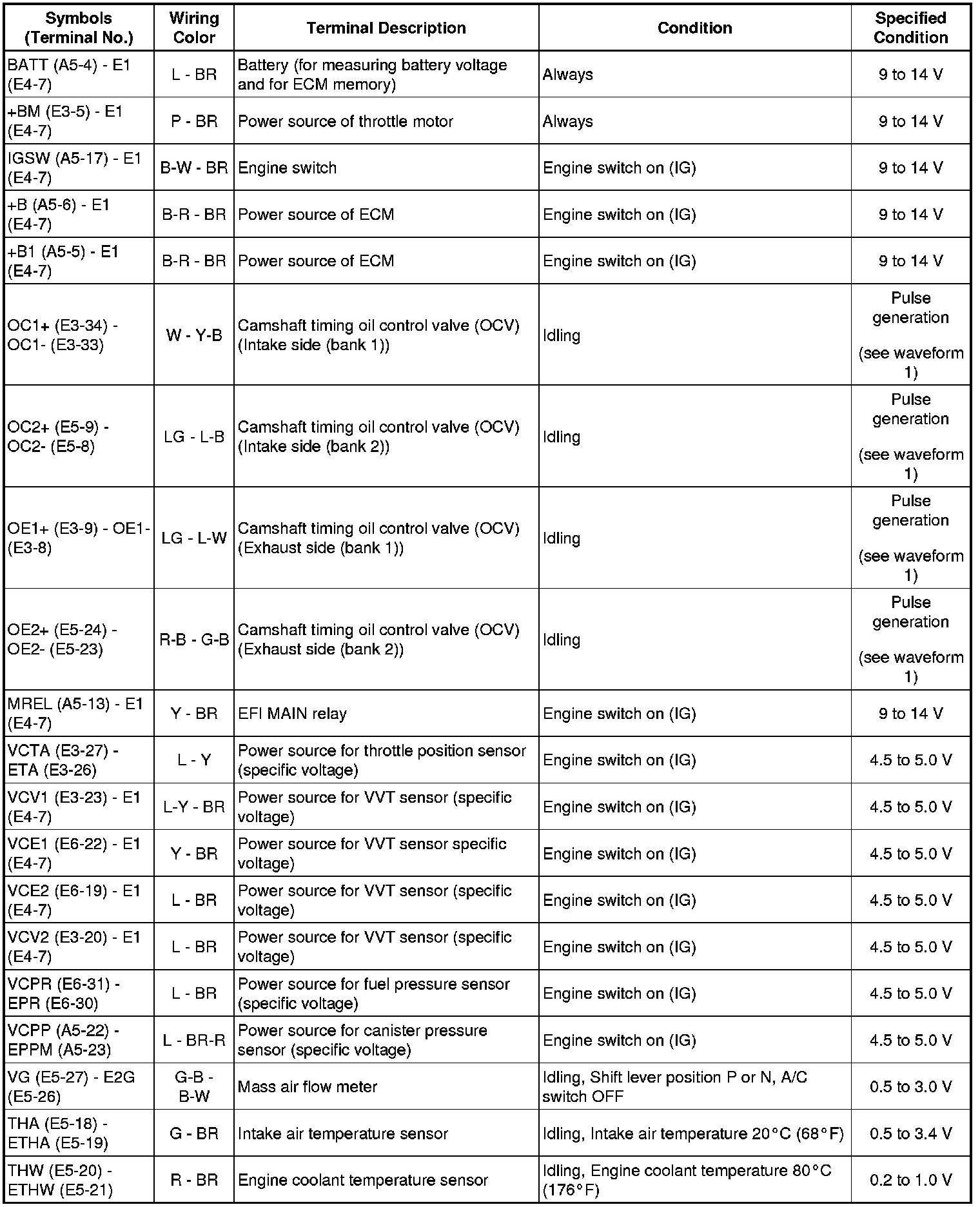 The standard normal voltage between each pair of the ECM terminals is shown in the table below. The appropriate conditions for checking each pair of the terminals are also indicated. The result of checks should be compared with the standard normal voltage for that pair of terminals, displayed in the Specified Condition column. The illustration above can be used as a reference to identify the ECM terminal locations.