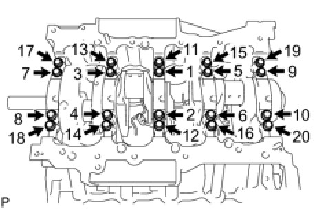 Install and uniformly tighten the 20 main bearing cap bolts in the sequence shown in the illustration.
