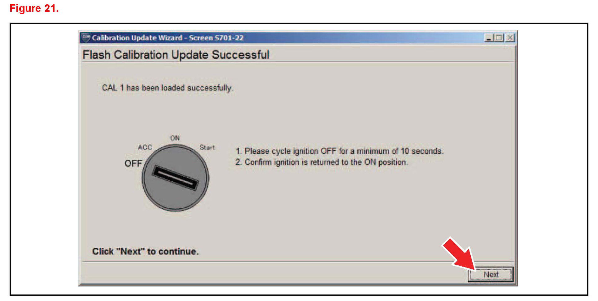 J. When Cal 1 has completed the update process turn ignition OFF for a minimum of 10 seconds. Then click Next.