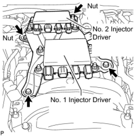 (b) Remove the 2 bolts, 2 nuts and 2 injector drivers with bracket.