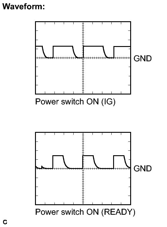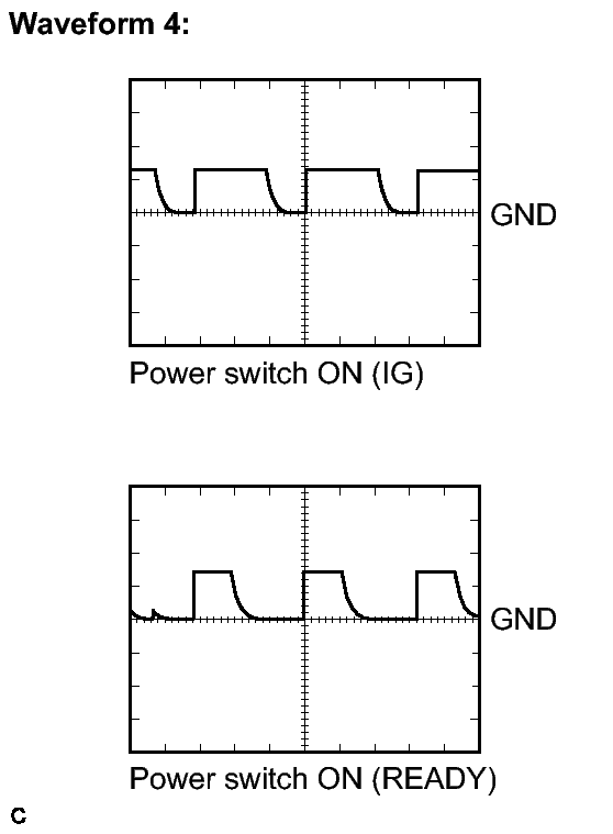 WAVEFORM 3 (REFERENCE):Item Content Symbols (Terminal No.) P (K73-5) - GND2 (K73-6) Tool Setting 2 V/DIV., 20 msec./DIV. Vehicle Condition Shift lever P position WAVEFORM 4 (REFERENCE):Item Content Symbols (Terminal No.) RDY (K73-22) - GND2 (K73-6) Tool Setting 10 V/DIV., 10 msec./DIV. Vehicle Condition Power switch ON (IG) or ON (READY)
