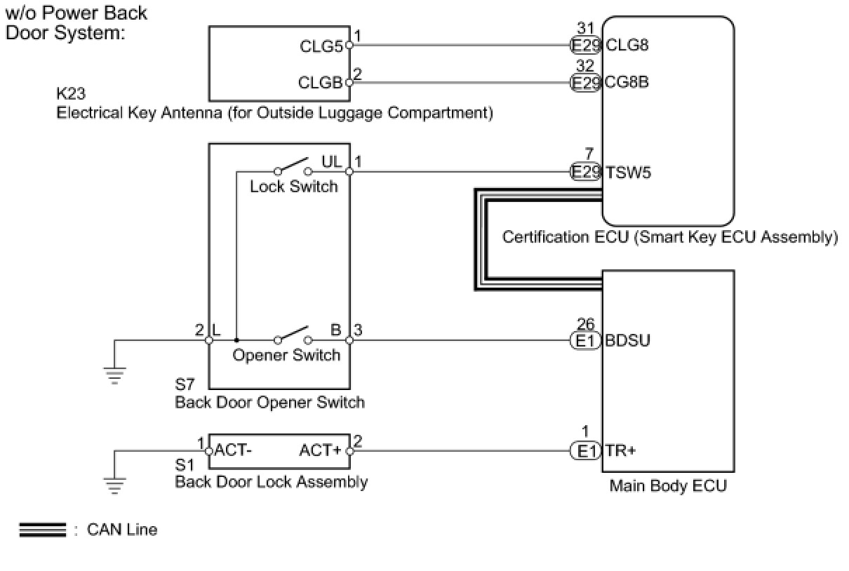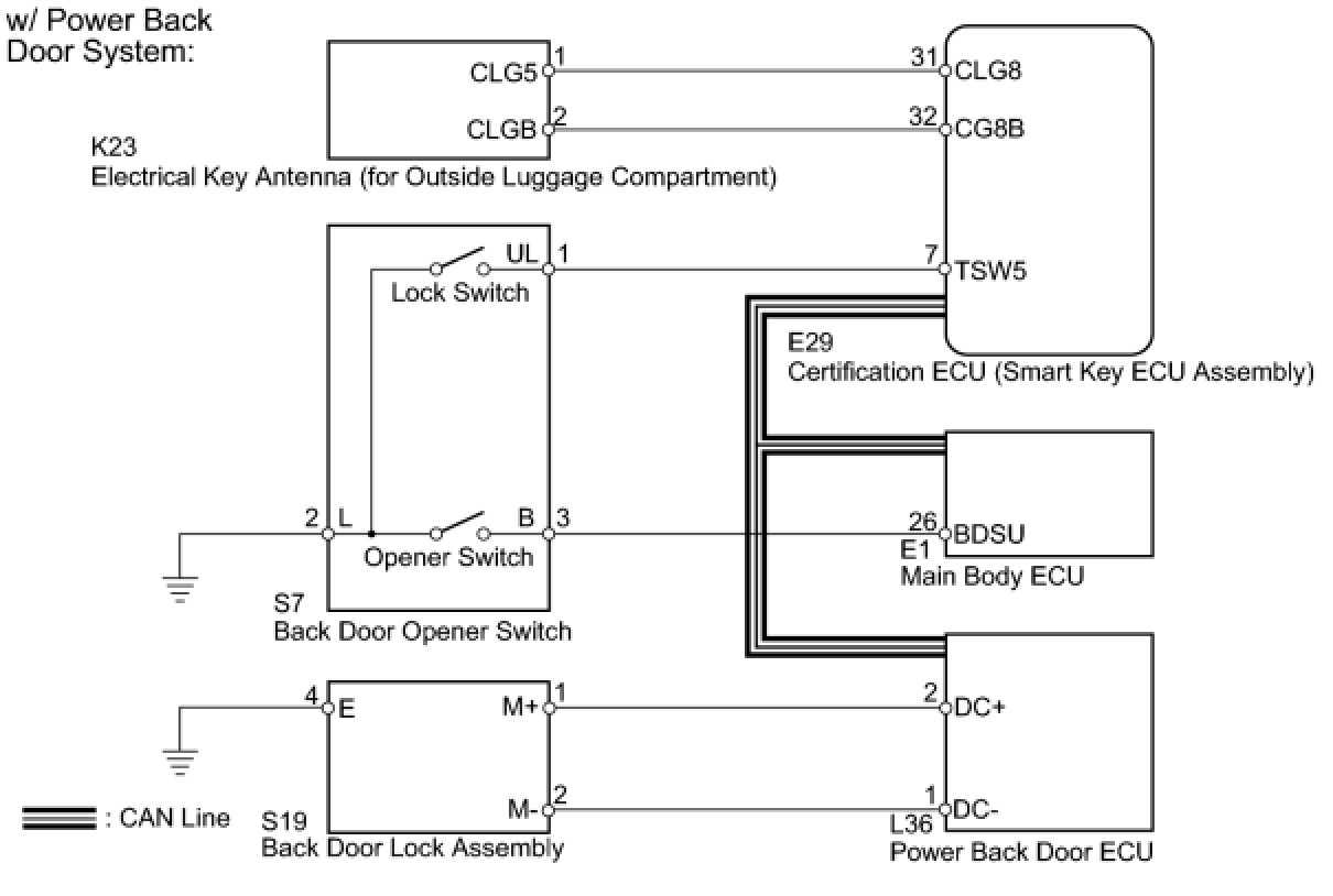 When the back door entry lock and unlock functions do not operate, one of the following may be malfunctioning: 1) power door lock control system, or 2) electrical key antenna (for outside luggage compartment), or 3) main body ECU (cowl side junction block LH), or 4) certification ECU (smart key ECU assembly).