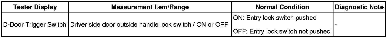 If the driver side door entry lock function does not operate but the entry unlock function operates, the communication line between the vehicle and electrical key transmitter is normal. The part at fault may be an entry lock switch circuit (certification ECU [smart key ECU assembly] -> driver side door outside handle [entry lock switch] -> driver side door electrical key oscillator).