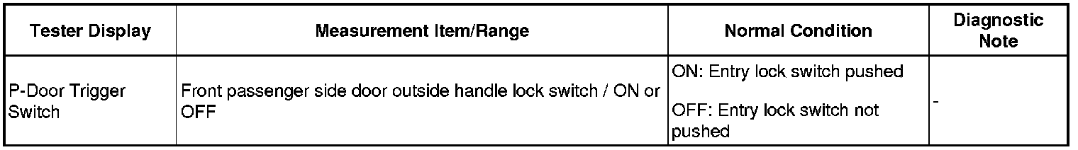 If the front passenger side door entry lock function does not operate but the entry unlock function operates, the communication line between the vehicle and electrical key transmitter is normal. The part at fault may be an entry lock switch circuit (certification ECU [smart key ECU assembly] -> front passenger side door outside handle [entry lock switch] -> front passenger side door electrical key oscillator).