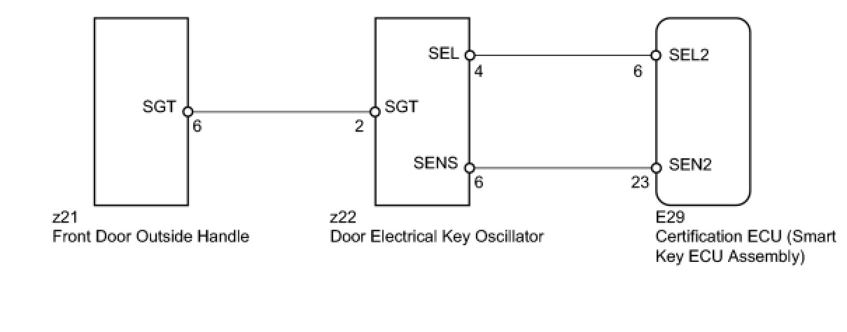 If the front passenger side door entry unlock function does not operate but the entry lock function operates, the communication line between the vehicle and electrical key transmitter is normal. The part at fault may be a touch sensor circuit (certification ECU [smart key ECU assembly] -> front passenger side door outside handle -> front passenger side door electrical key oscillator).