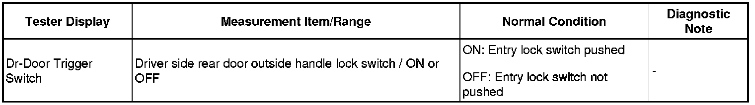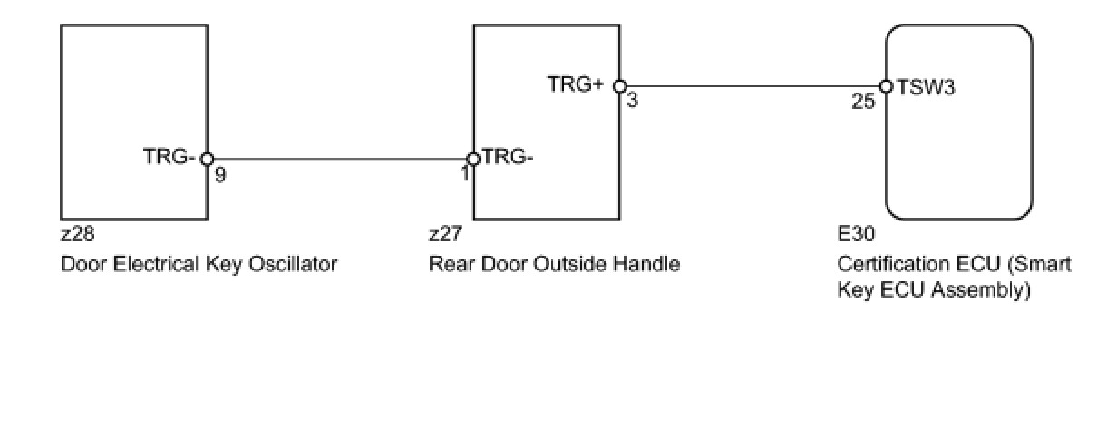 If the driver side rear door entry lock function does not operate but the entry unlock function operates, the communication line between the vehicle and electrical key transmitter is normal. The part at fault may be an entry lock switch circuit (certification ECU [smart key ECU assembly] -> driver side rear door outside handle [entry lock switch] -> driver side rear door electrical key oscillator).