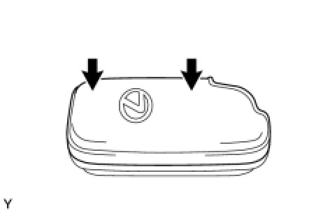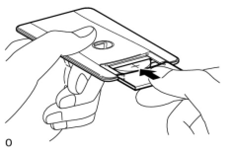 (a) Push in and install a new transmitter battery (lithium battery (CR2412)) while being careful of the following: 1) the positive (+) and negative (-) terminals of the battery; and 2) being sure to insert the battery between the 2 terminals and deep into the card, in the direction of the arrow.