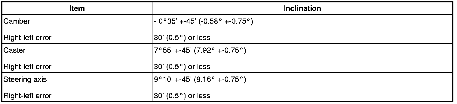 - If the steering axis inclination is not as specified after the camber and caster have been correctly adjusted, check the steering knuckle and front wheel for distortion or looseness.