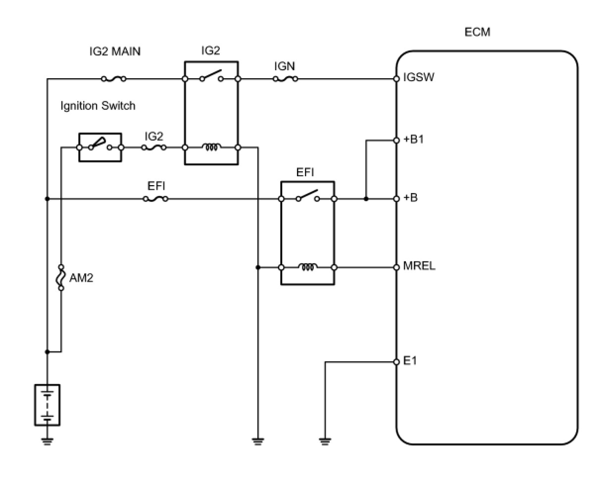 When the ignition switch is turned ON, the battery voltage is applied to terminal IGSW of the ECM. The ECM MREL output signal causes a current to flow to the coil, closing the contacts of the EFI (Marking: EFI MAIN) relay and supplying power to terminal +B of the ECM.