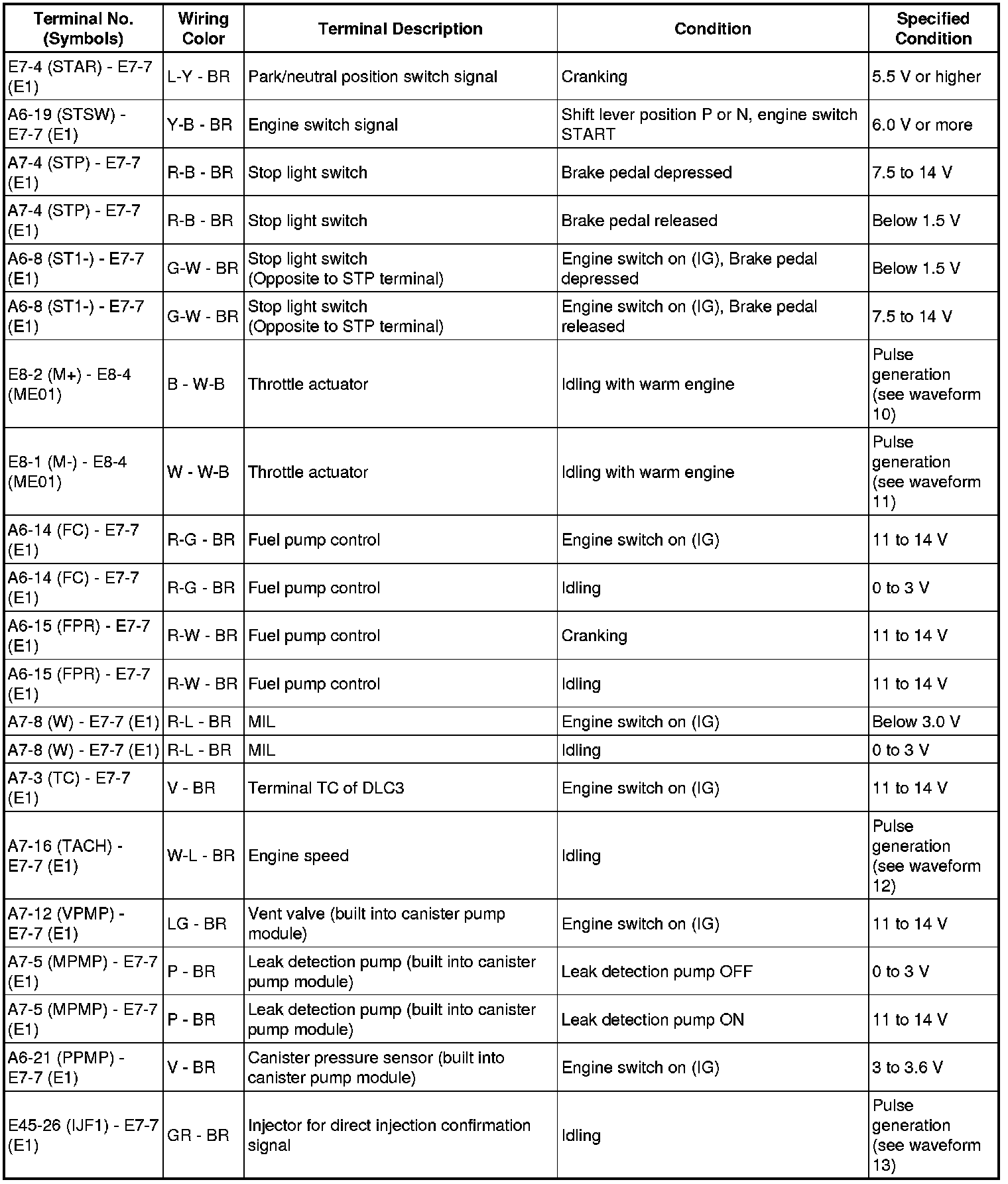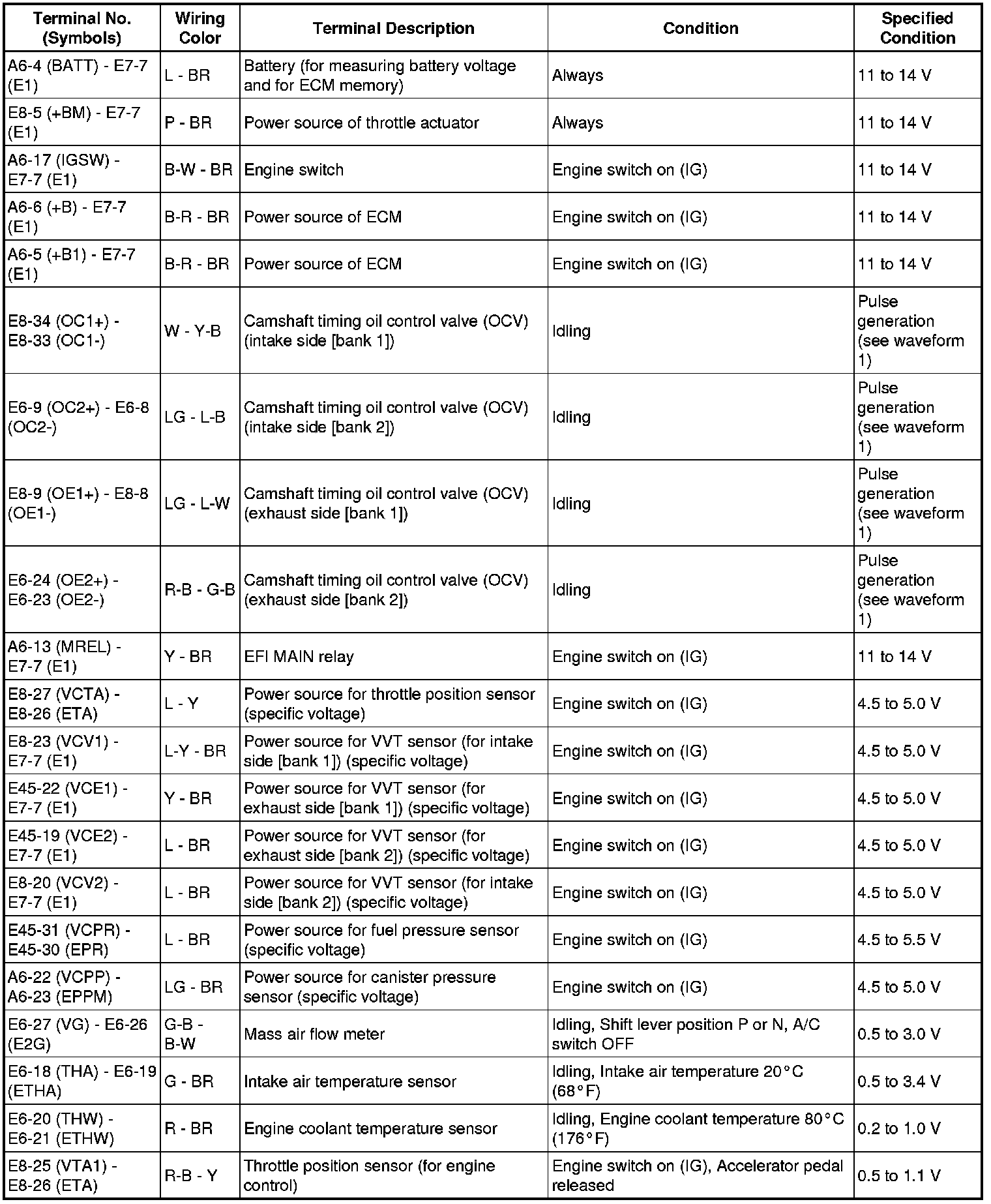 The standard normal voltage between each pair of the ECM terminals is shown in the table below. The appropriate conditions for checking each pair of the terminals are also indicated. The result of checks should be compared with the standard normal voltage for that pair of terminals, displayed in the Specified Condition column. The illustration above can be used as a reference to identify the ECM terminal locations.