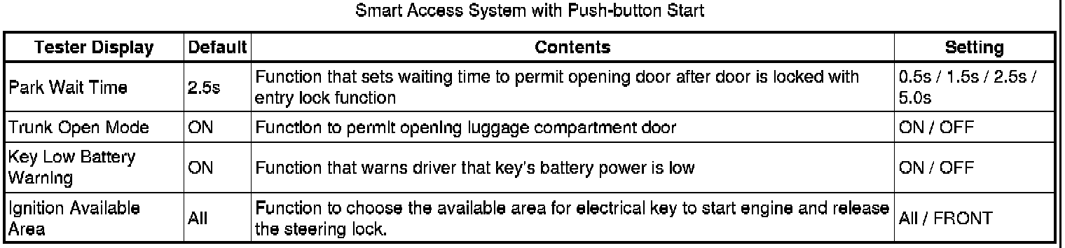 The function only changes the entry unlock mode of the smart access system with push-button start. It does not switch the unlocking of the wireless door lock control.