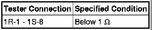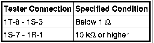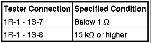 (2) Connect the battery's positive (+) lead to terminal 1T-8 and negative (-) lead to terminal 1S-3. Measure the resistance between terminals 1S-7 and 1R-1 when battery voltage is applied between the terminals.