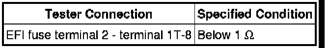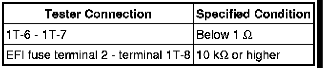 (2) Connect the battery's positive (+) lead to terminal 1T-6 and negative (-) lead to terminal 1T-7. Measure the resistance between EFI fuse terminal 2 and terminal 1T-8 when battery voltage is applied between the terminals.