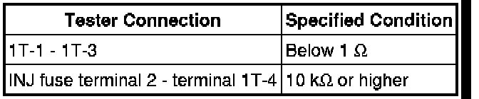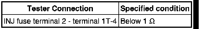 (2) Connect the battery's positive (+) lead to terminal 1T-1 and negative (-) lead to terminal 1T-3. Measure the resistance between INJ fuse terminals 2 and terminal 1T-4 when battery voltage is applied between the terminals.