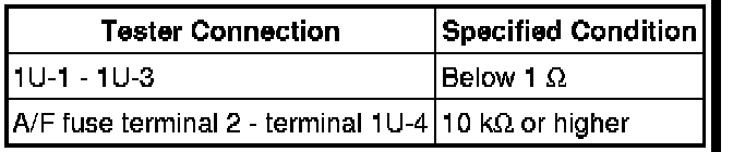 (2) Connect the battery's positive (+) lead to terminal 1U-1 and negative (-) lead to terminal 1U-3. Measure the resistance between A/F fuse terminals 2 and terminal 1U-4 when battery voltage is applied between the terminals.