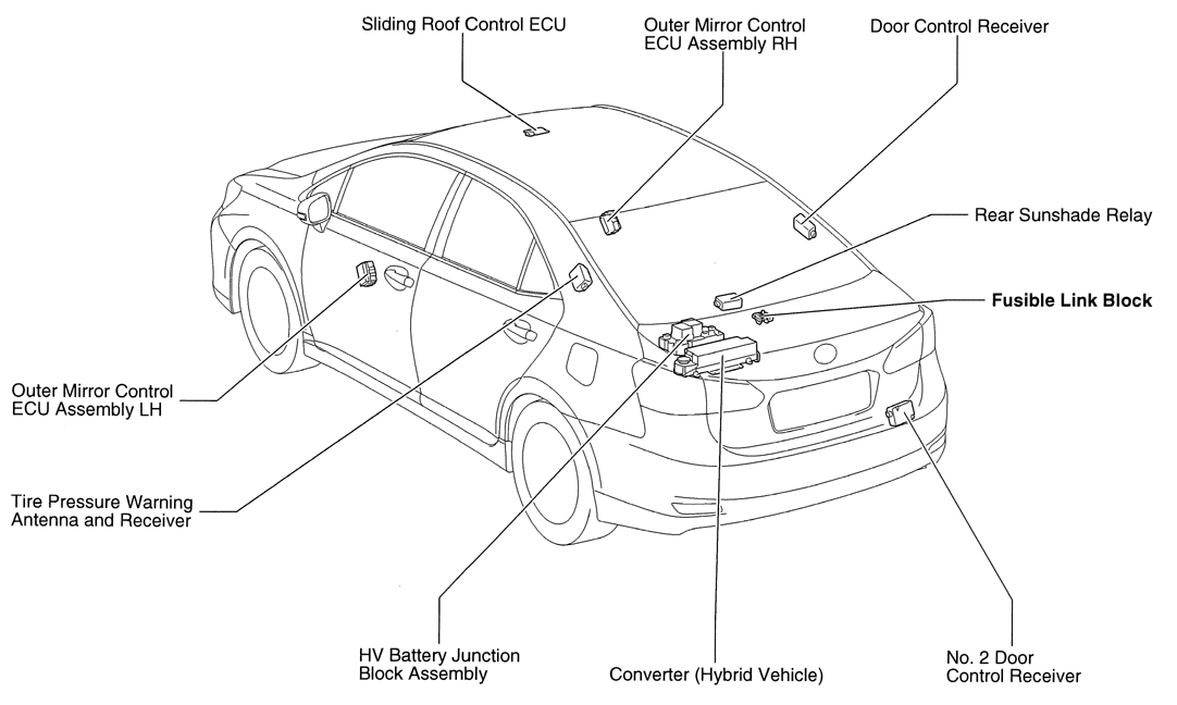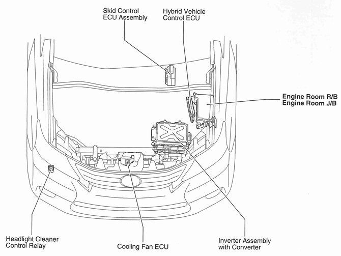 | Hybrid Vehicle Control ECU | Left side of engine compartment. See Figure. |