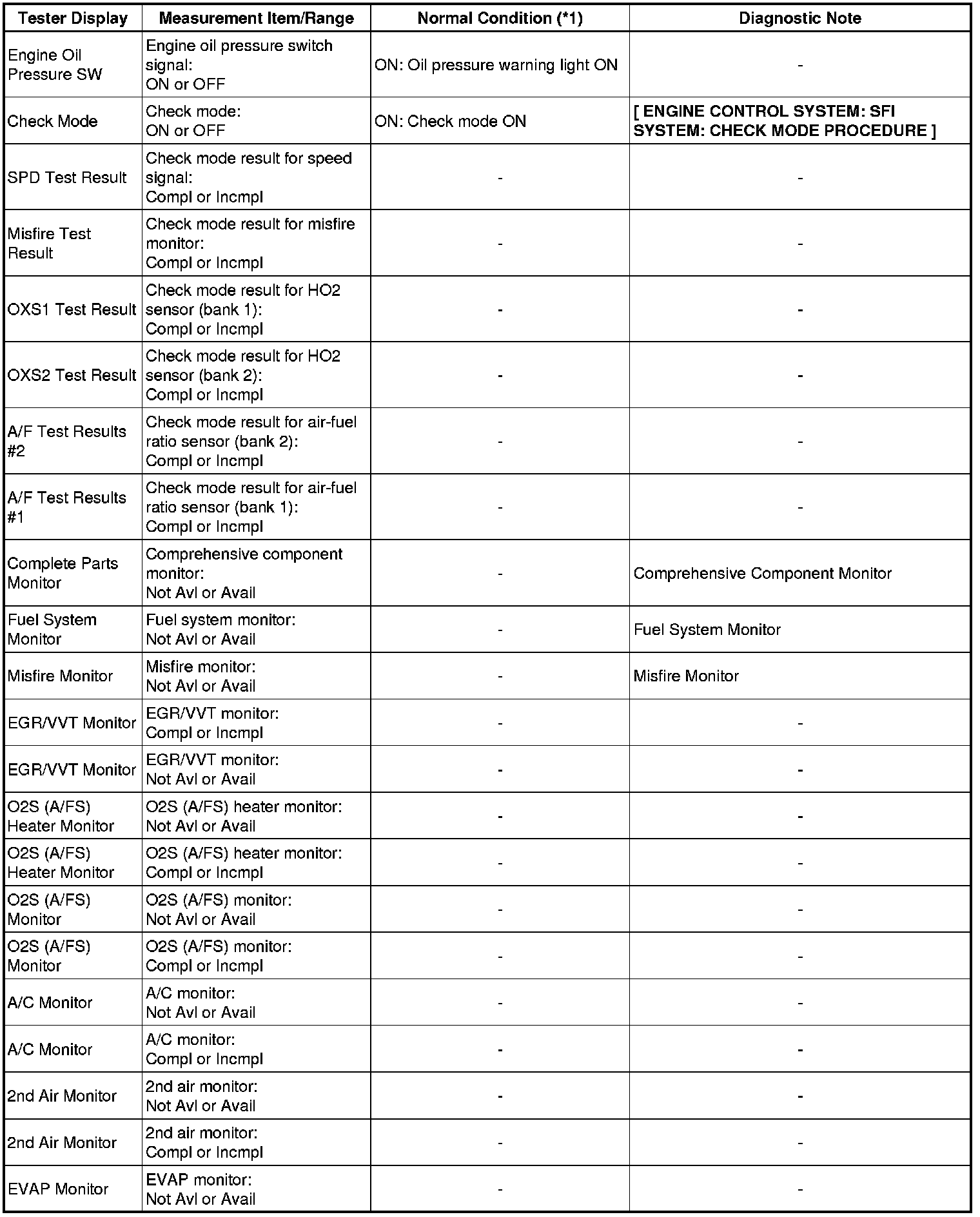 In the table below, the values listed under Normal Condition are reference only. Do not depend solely on these values when determining whether or not a part is faulty.