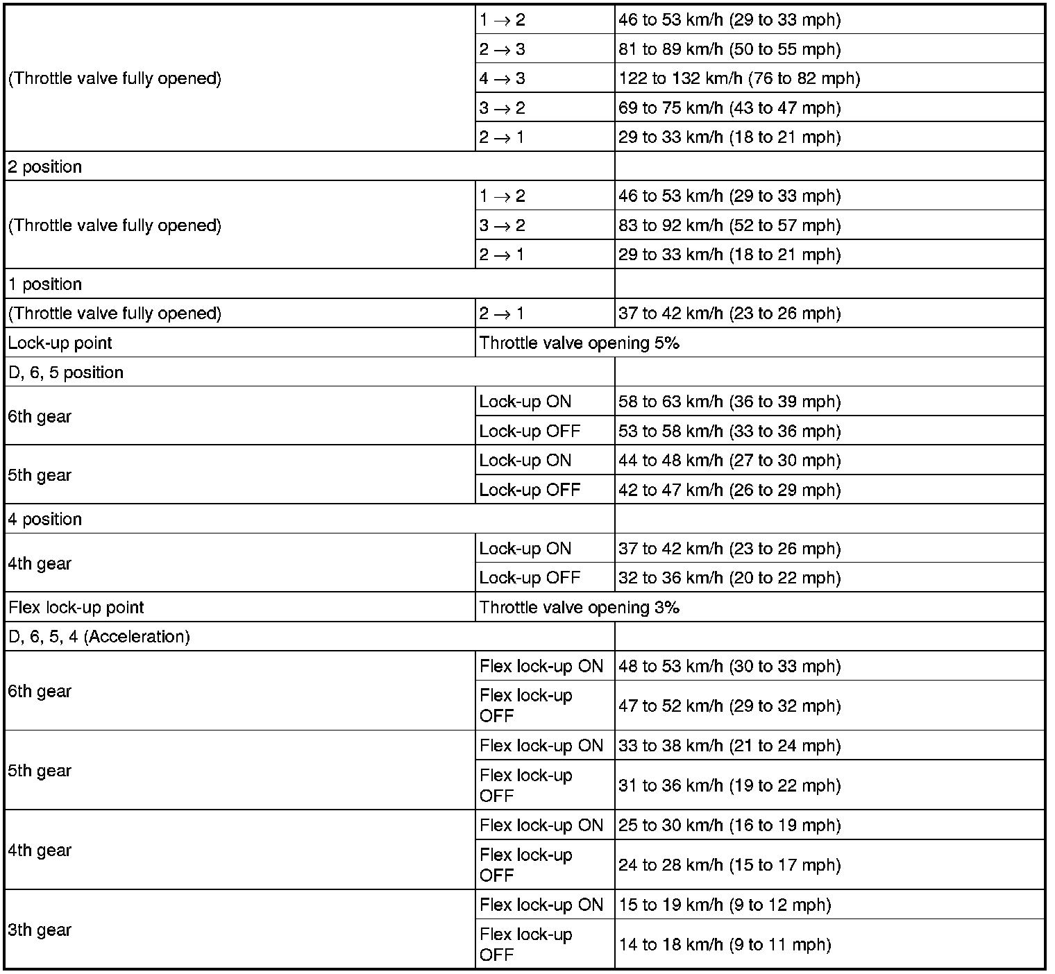 * All shift point values indicated in the above tables are actual values. Therefore, if checking a shift point with a chassis dynamometer, keep in mind that there is a range of error in the chassis dynamometer indication.