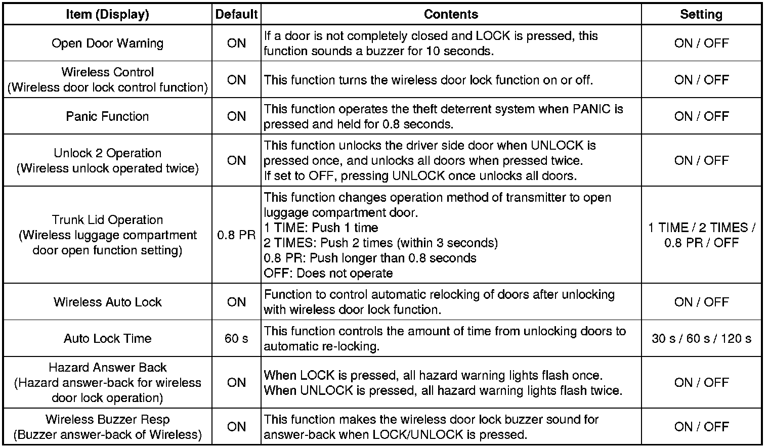 * *2: This function is linked with the power window wireless transmitter-linked function. If the power window wireless transmitter-linked function is set to OFF, the sliding roof wireless transmitter-linked function will not operate even when it is set to ON.