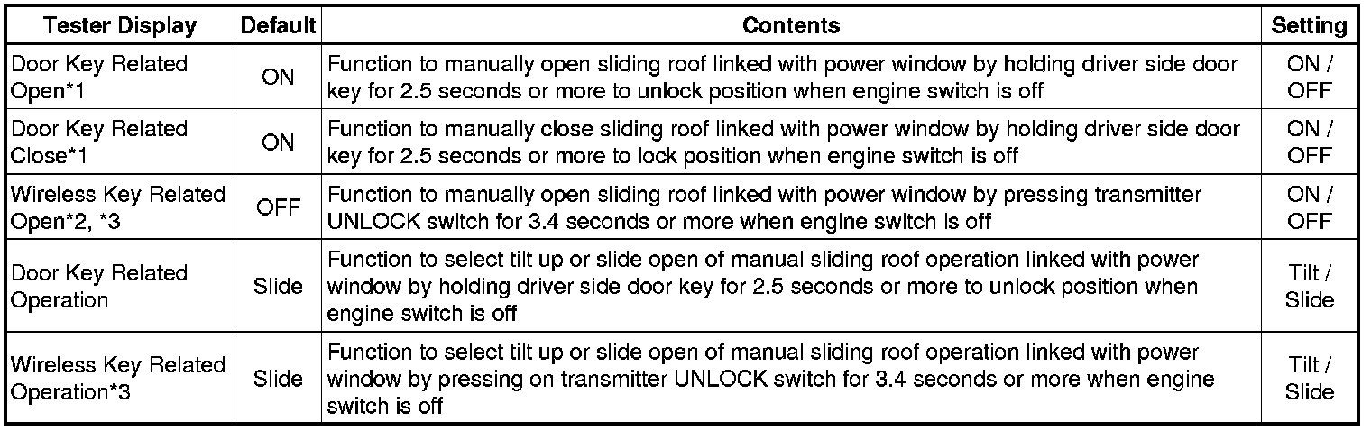* *1: This function is linked with the power window key-linked function. If the power window key-linked function is set to OFF, the sliding roof key-linked function will not operate even when it is set to ON.