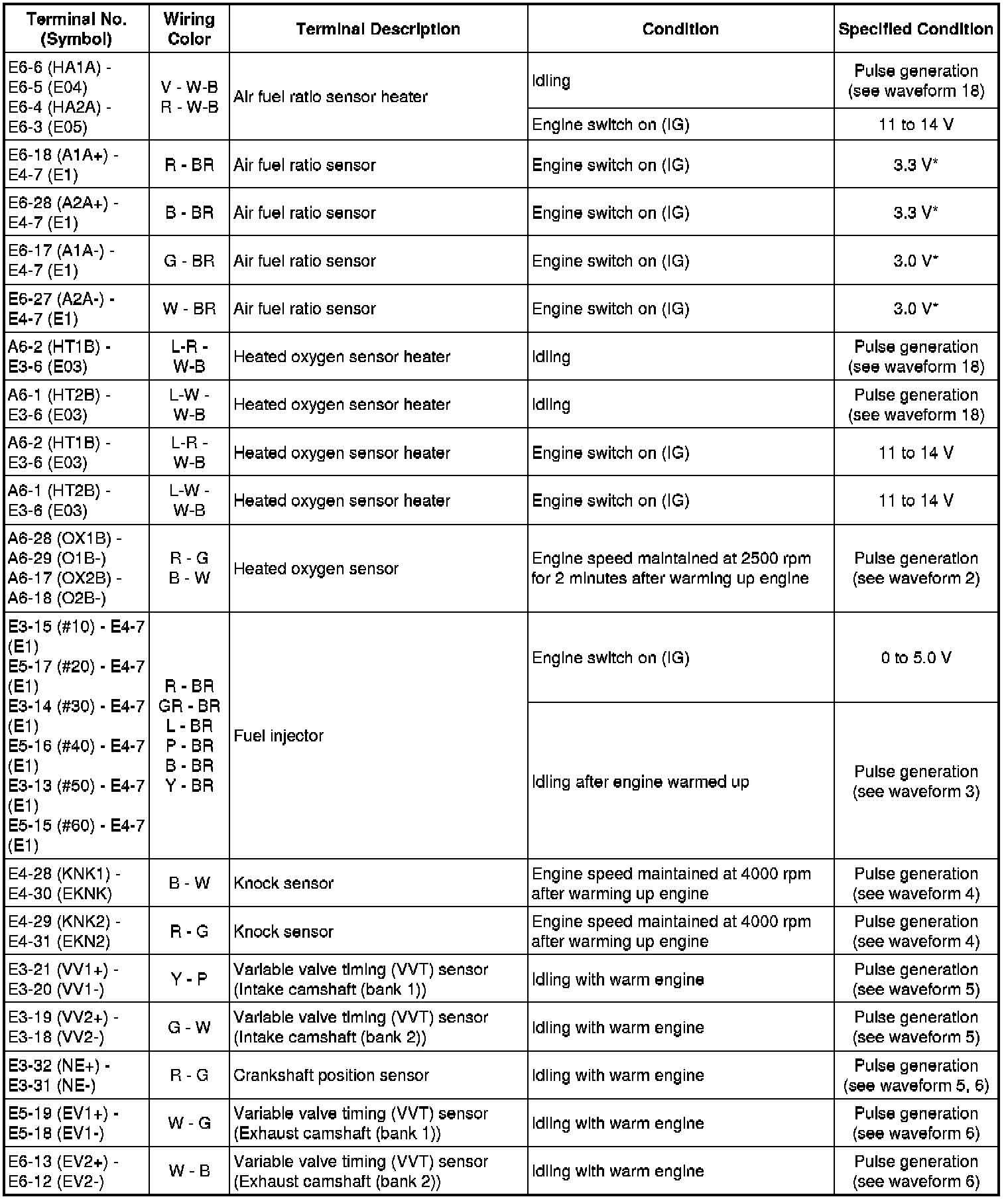 The standard normal voltage between each pair of the ECM terminals is shown in the table below. The appropriate conditions for checking each pair of the terminals are also indicated. The result of checks should be compared with the standard normal voltage for that pair of terminals, displayed in the Specified Condition column. The illustration above can be used as a reference to identify the ECM terminal locations.