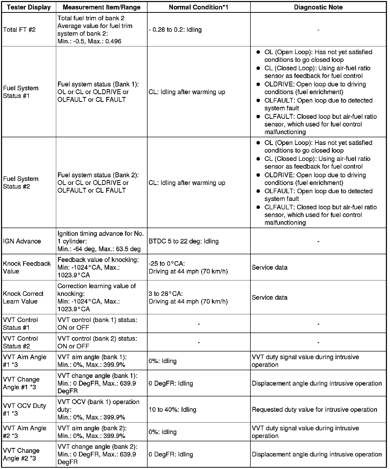 * *3: Data List values are only displayed when performing the following Active Test: Control the VVT System (Bank 1, 2), Control the VVT Linear (Bank 1, 2) and Control the VVT Exhaust Linear (Bank 1, 2). For other Active Test, the Data List value will be 0.